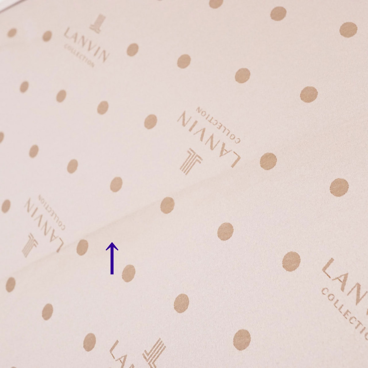 シャンパンベージュの生地に規則的にドットとロゴパターンとブランドロゴを入れてたお洒落なデザインの傘です。