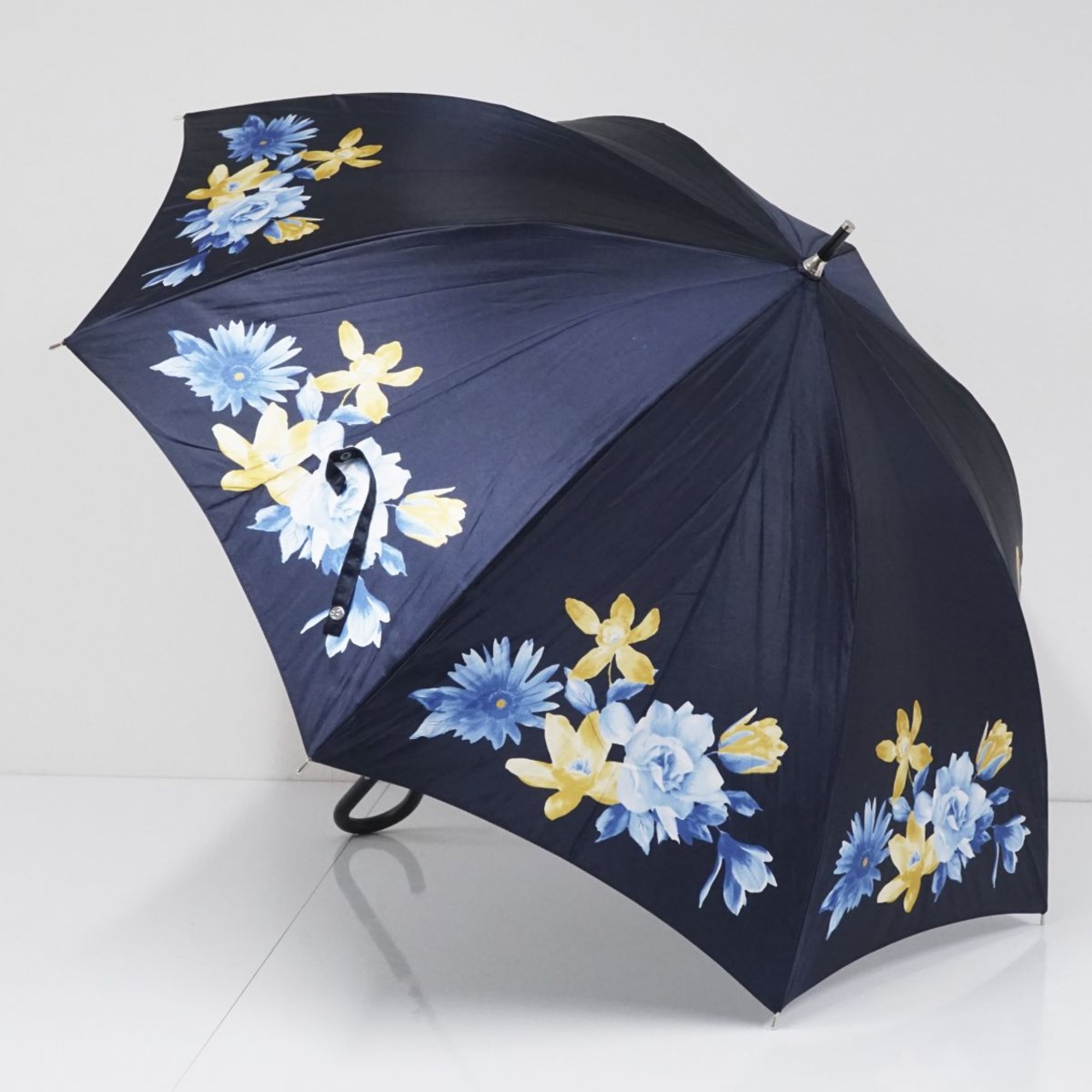 光沢のあるネイビーの生地をベースにフラワーモチーフが描かれたエレガントなデザインです。