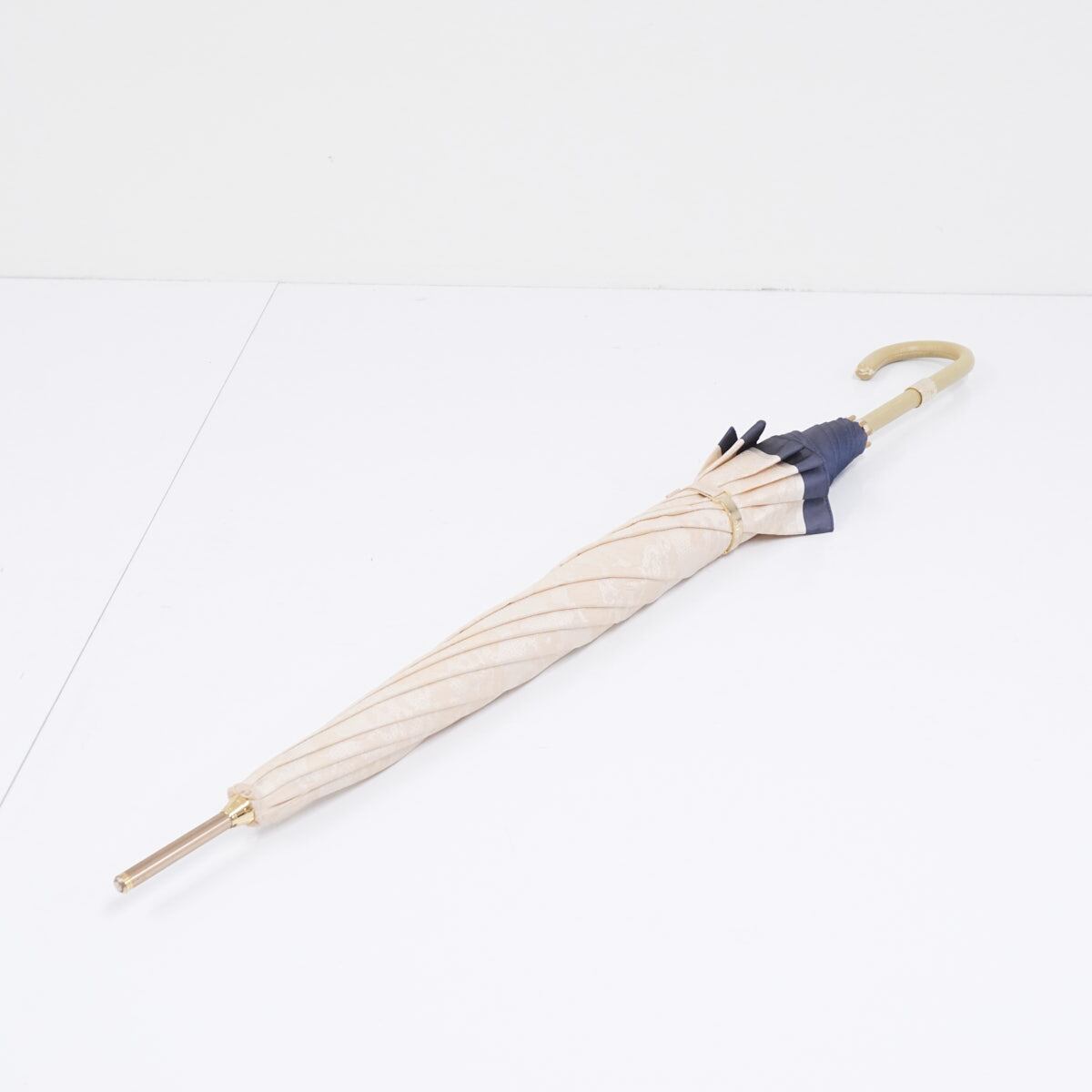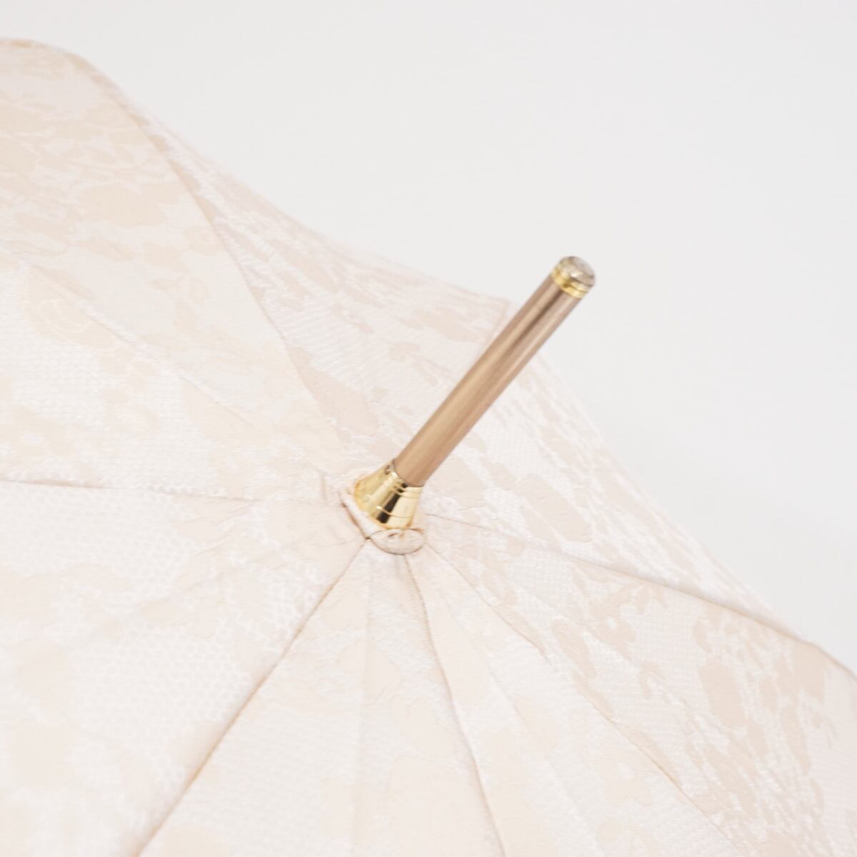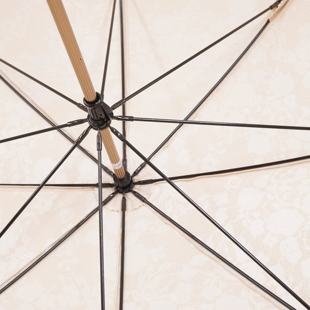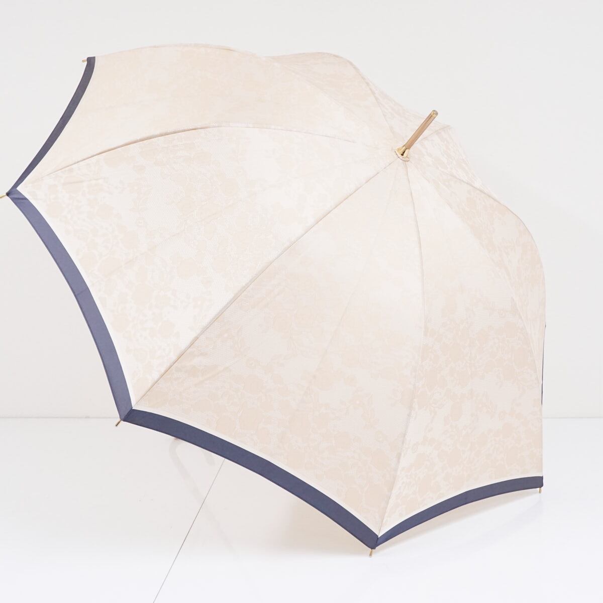 上品な光沢のあるベージュ系の生地にレースのようなボタニカル柄がゴージャスでシックなラグジュアリーなデザインの傘です。