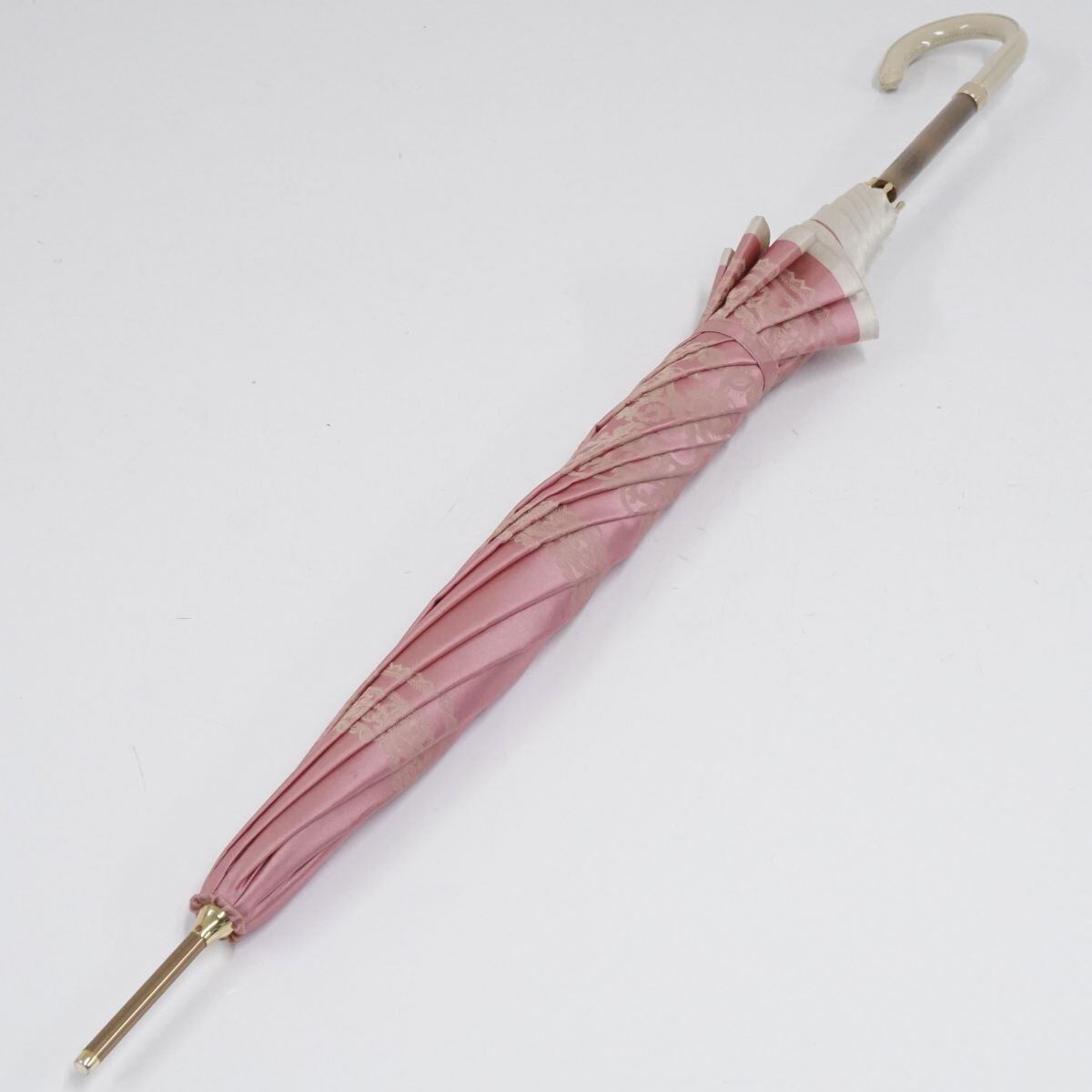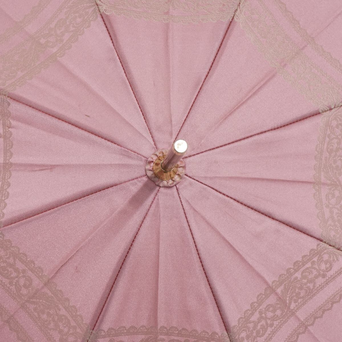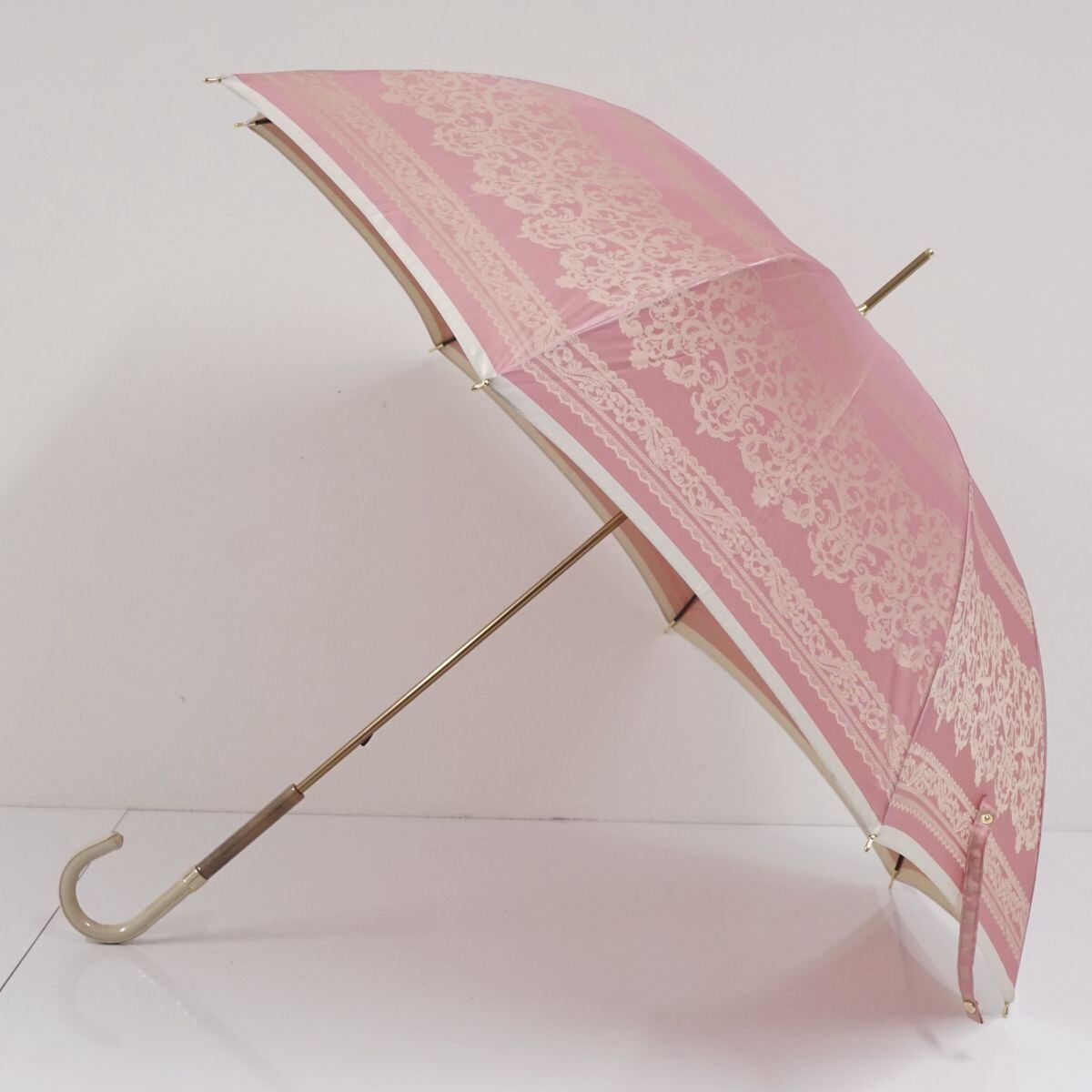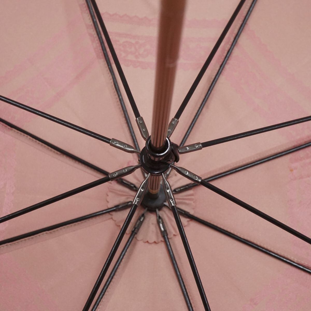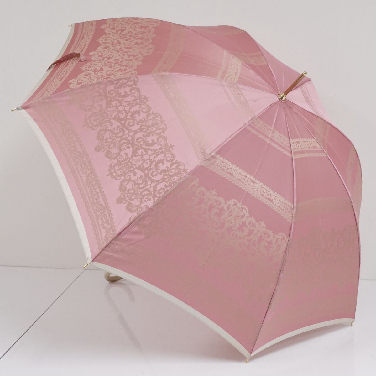 上品な光沢のあるピンクの生地にレース柄がゴージャスでシックなラグジュアリーデザインの傘です。