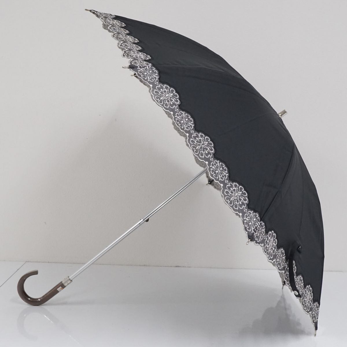 ブラックの生地に外周をオーガンジーレースと刺繍で囲んだエレガントなデザインの傘です。