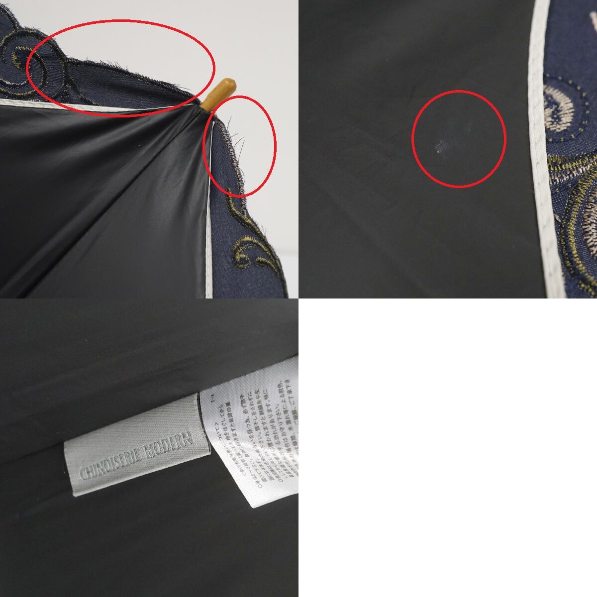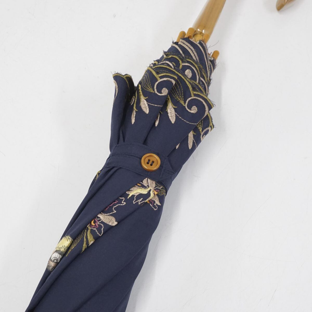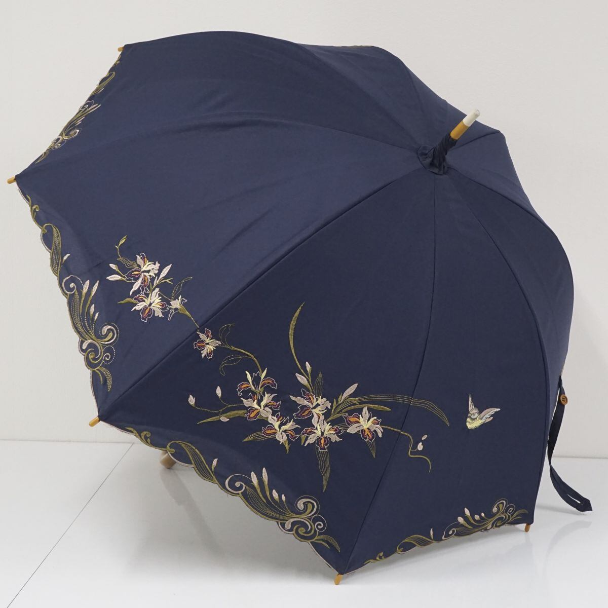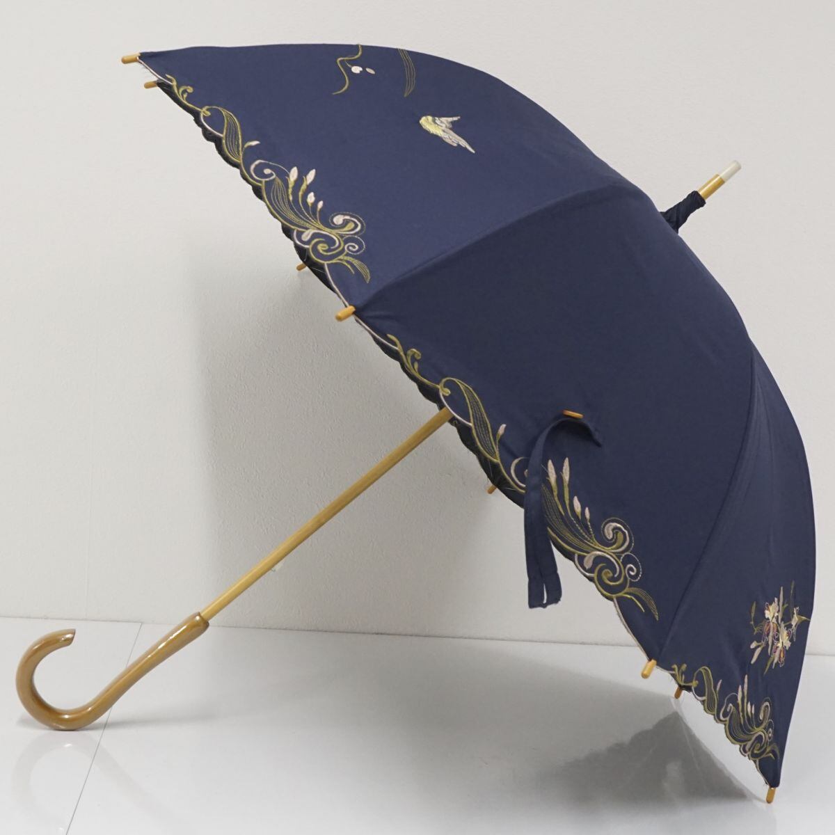 晴雨兼用日傘 chinoiserie modern シノワズリーモダン USED美品 ネイビー スズメ 花 刺繍 かわず張 女優日傘 遮光 遮熱 55cm S2144