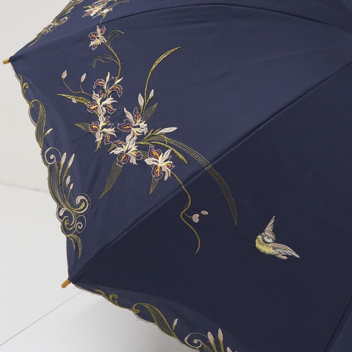 ネイビーの生地に草花とスズメの刺繍が上品な雰囲気のパラソルです。