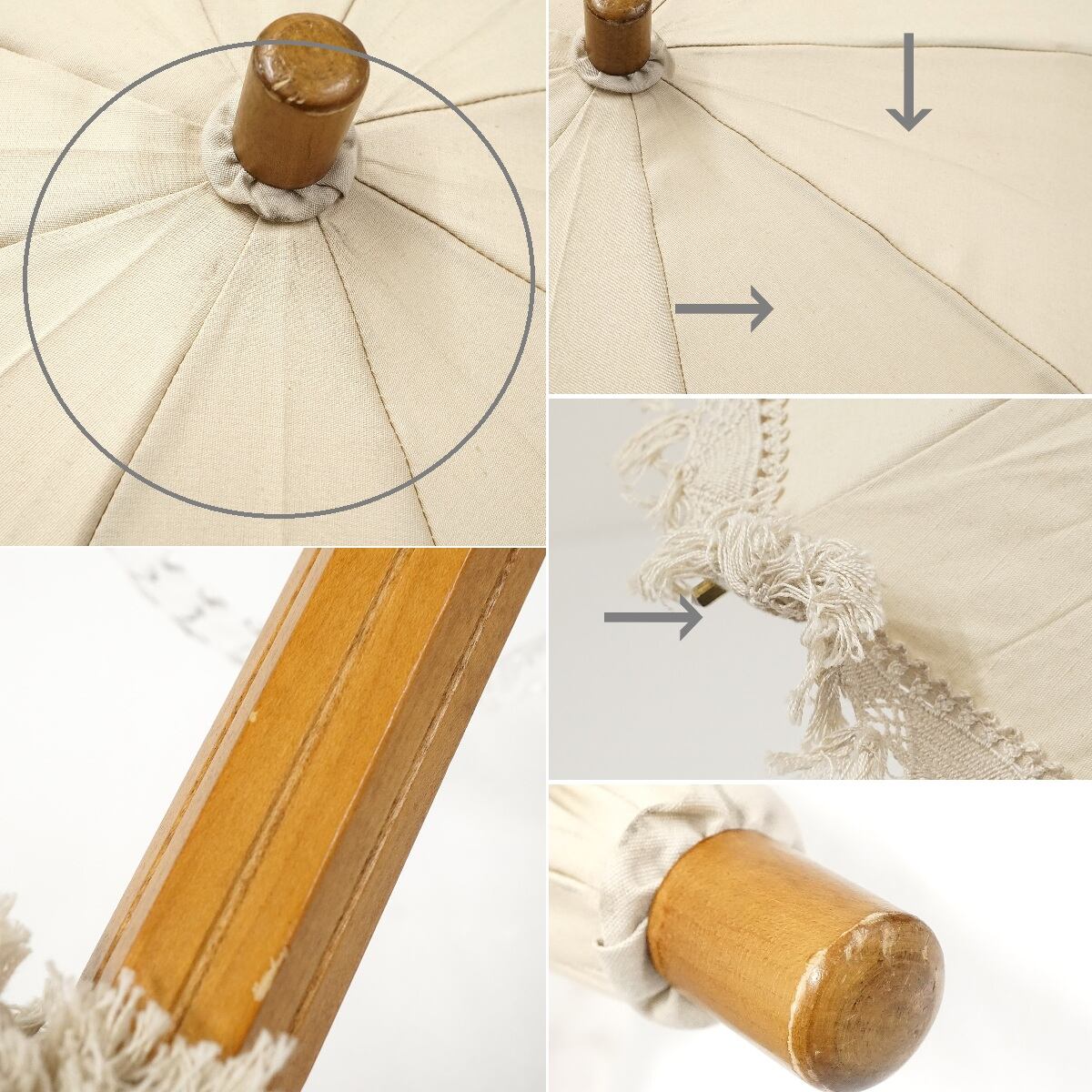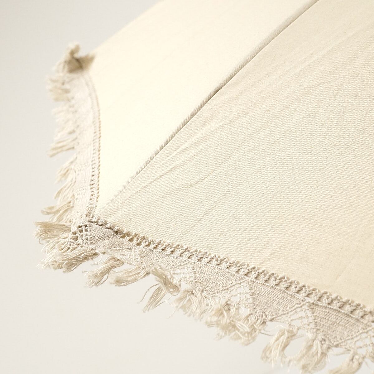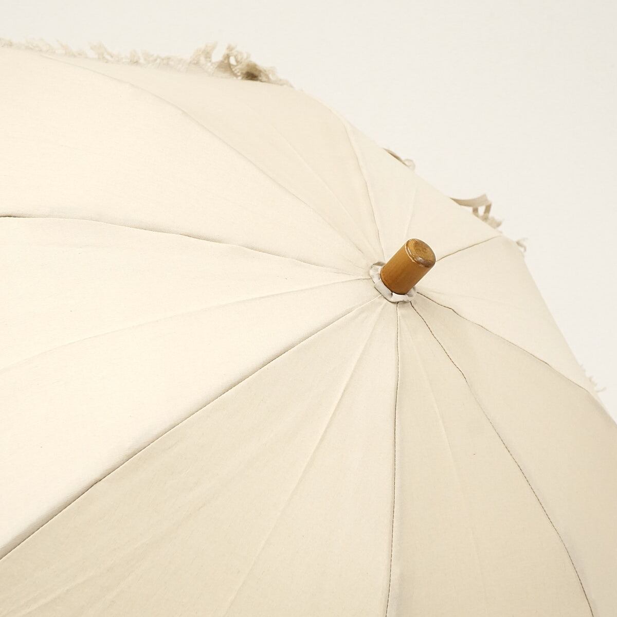 高級日傘 大森商店 USED美品 フリンジ バングルハンドル 綿 麻 シンプル 天然木 パラソル ライトベージュ UV 40cm S2156