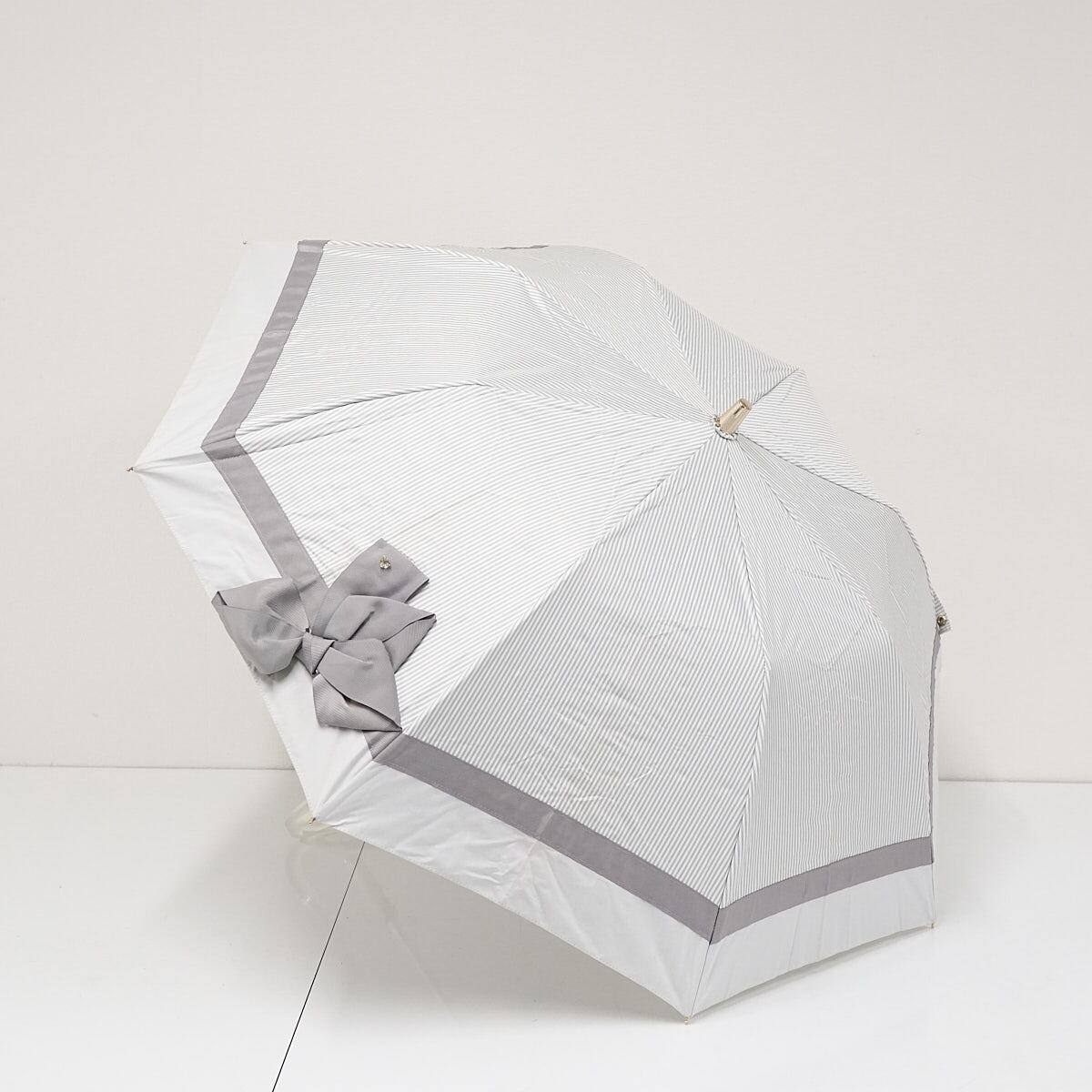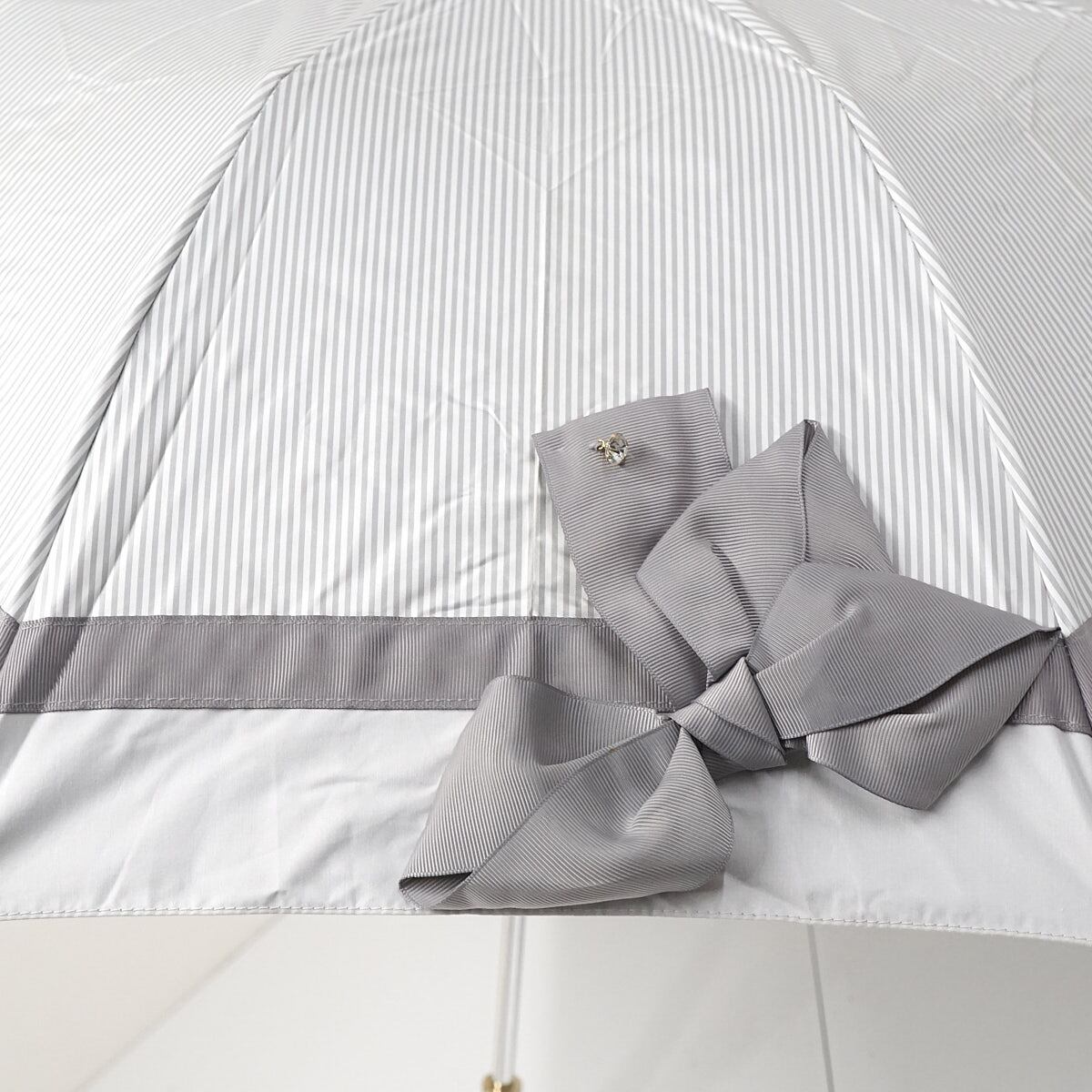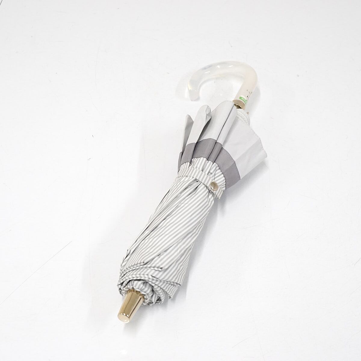 折りたたみ日傘 LANVIN en Bleu ランバンオンブルー USED美品 晴雨兼用 ビジューリボン ライトグレー ストライプ UV 遮光 FS8811