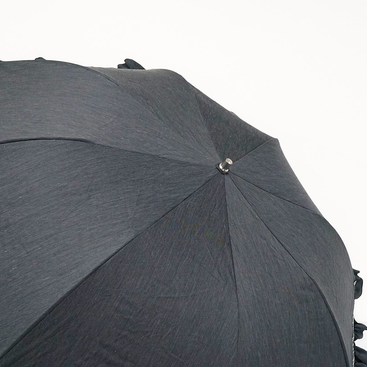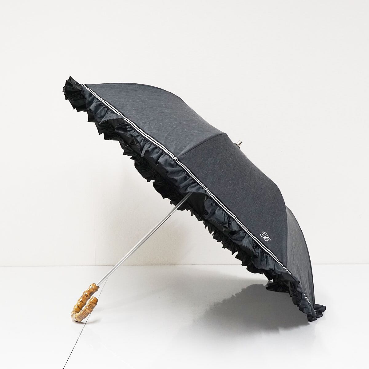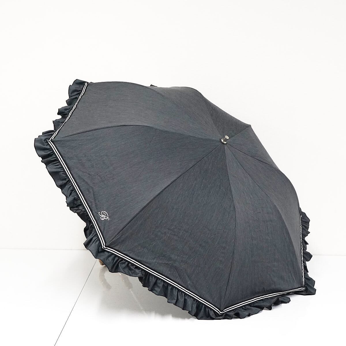 デニム風の生地の外周にフリルとボーダーテープをデザインしたキュートなパラソルです。