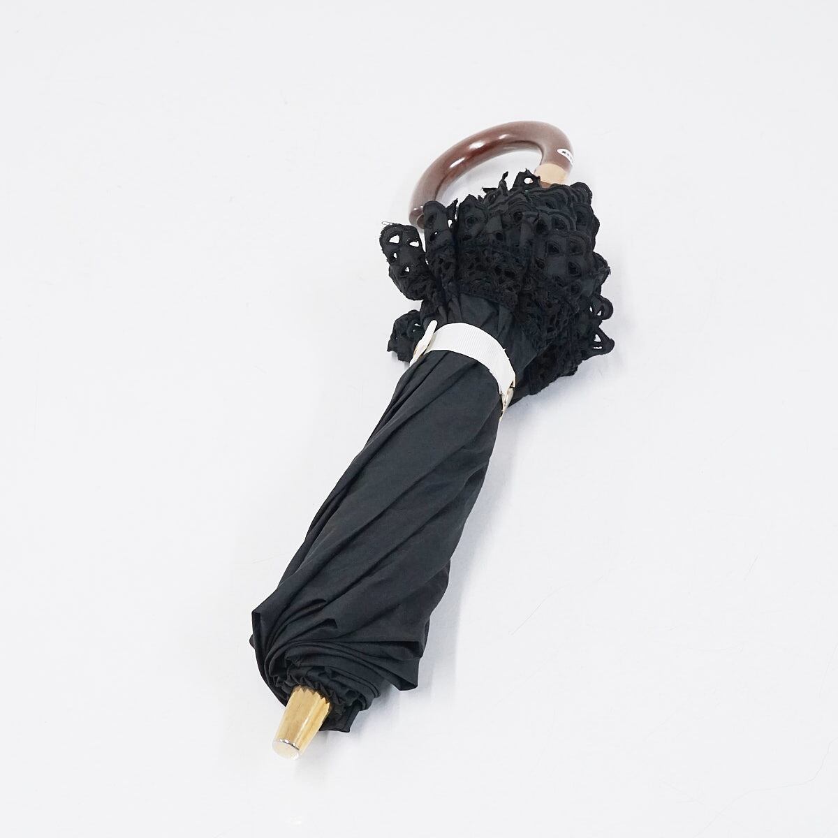スカラップレースやはしごレースで縁取りを飾ったフリルがレディライクなデザインの折り畳みパラソルです。