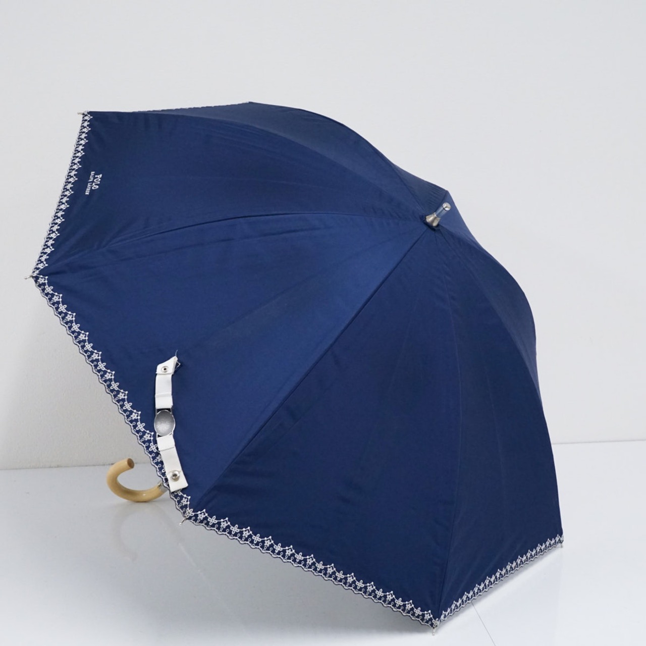 ネイビーxホワイトの上品なカラーで、スカラップフリル刺繍を組み合わせたクラシカルなデザインのパラソルです。