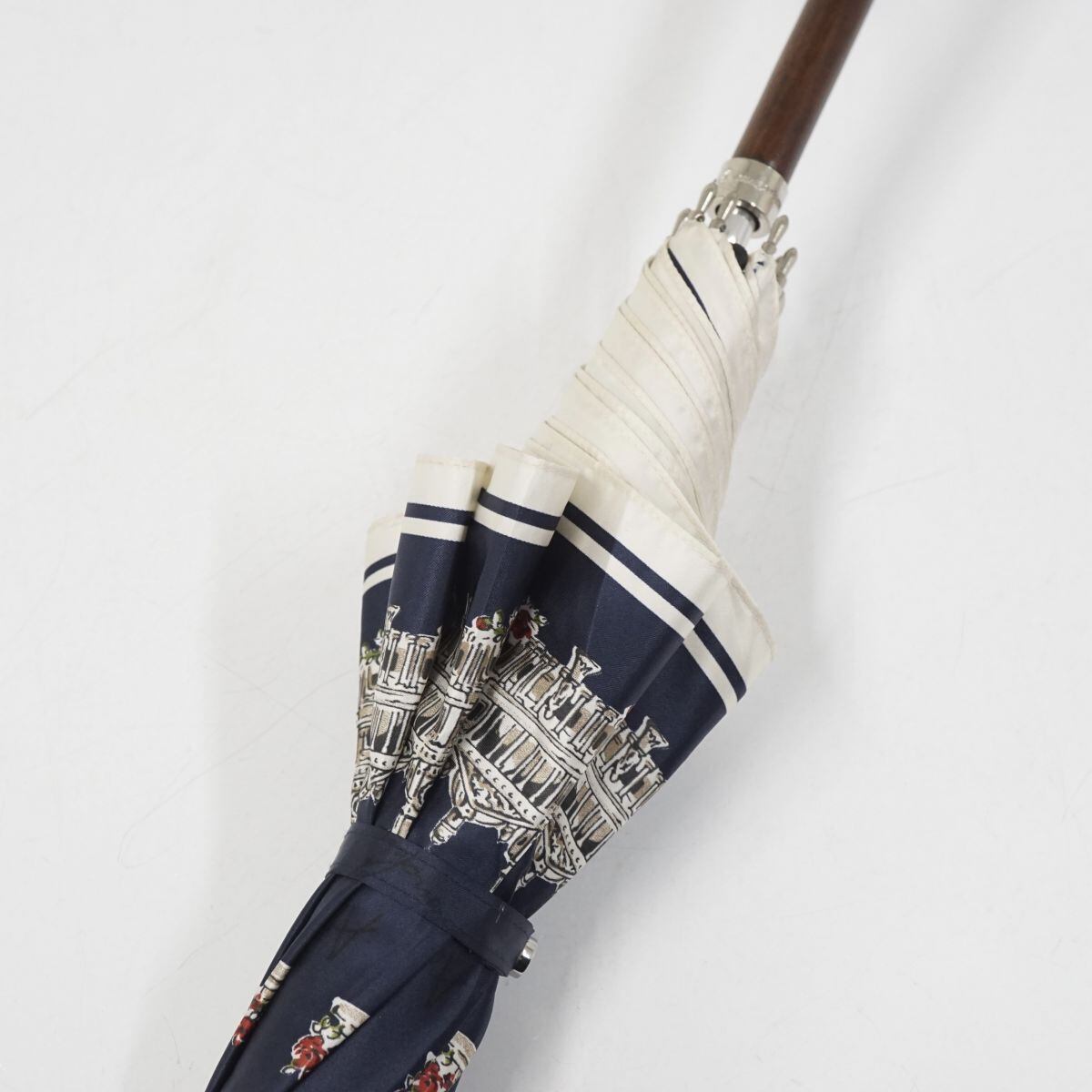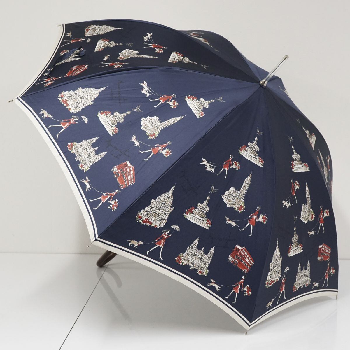 耐風傘 Aquascutum アクアスキュータム USED美品 ネイビー 街並み 女性 犬 イラスト ジャンプ グラス骨 風に強い 60cm S2225