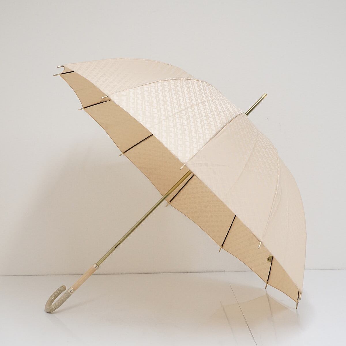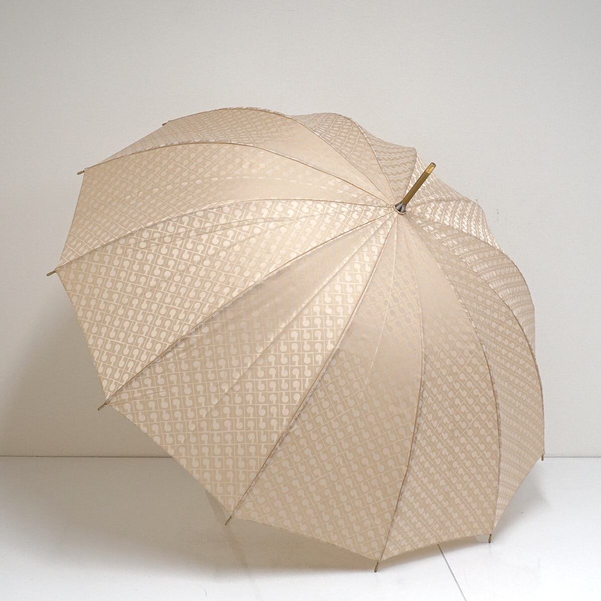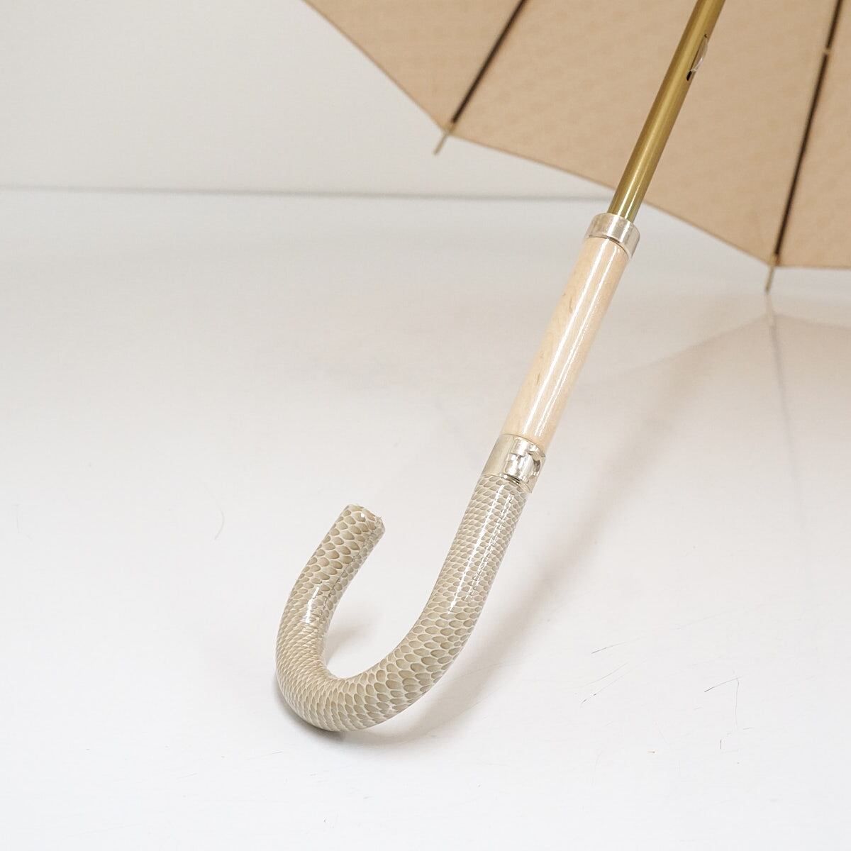 12本骨傘 GHERARDINI ゲラルディーニ USED美品 モノグラム Gロゴ ライトベージュ グラス骨 多間 リザード柄x木製手元 58cm S2250