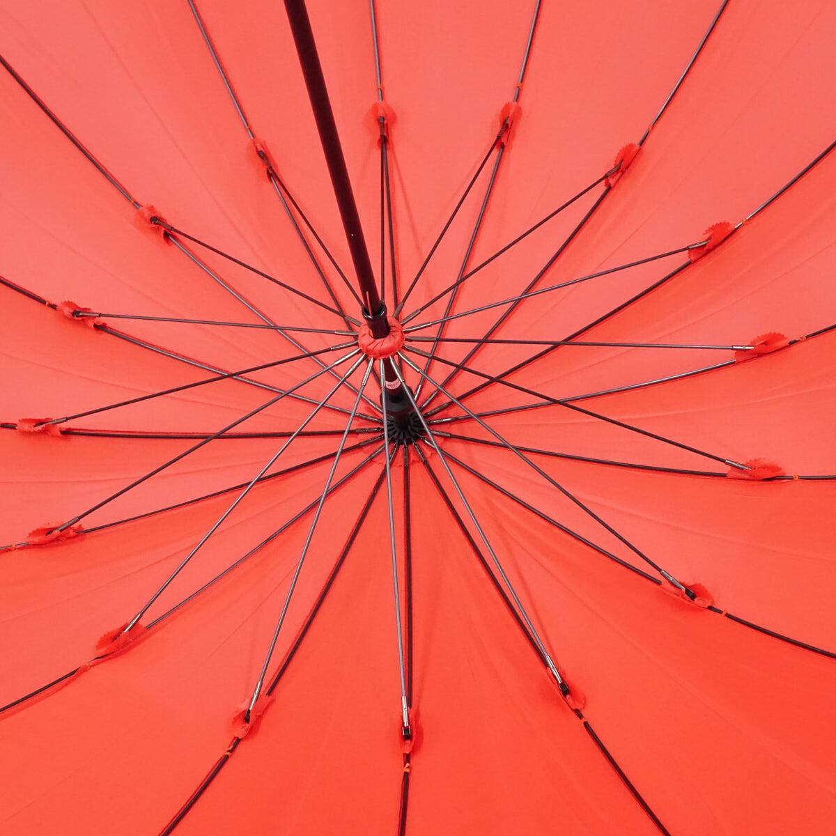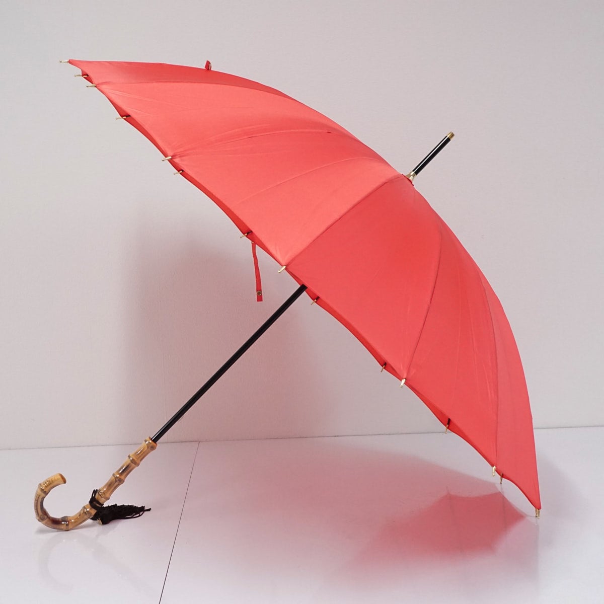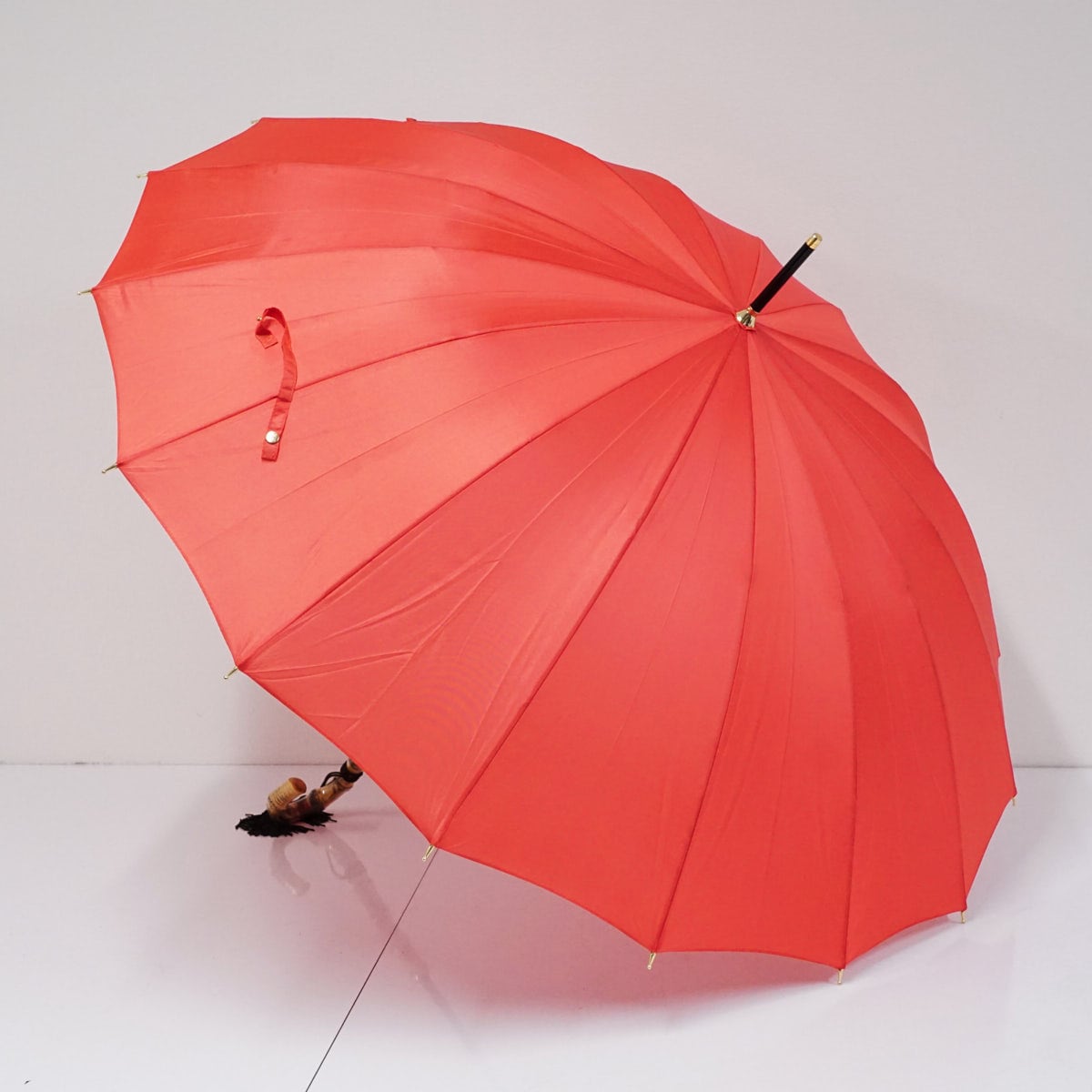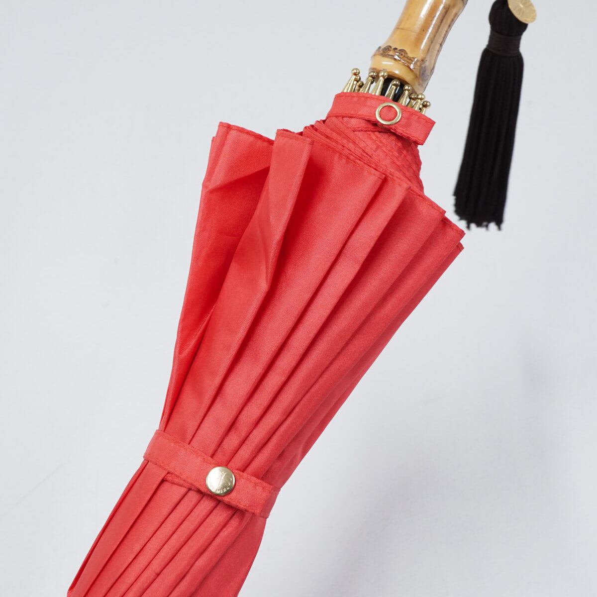 ポピーレッド系の光沢生地を使い、シンプルでありながら16本骨が作り出す円を描くフォルムが麗しい逸品です。