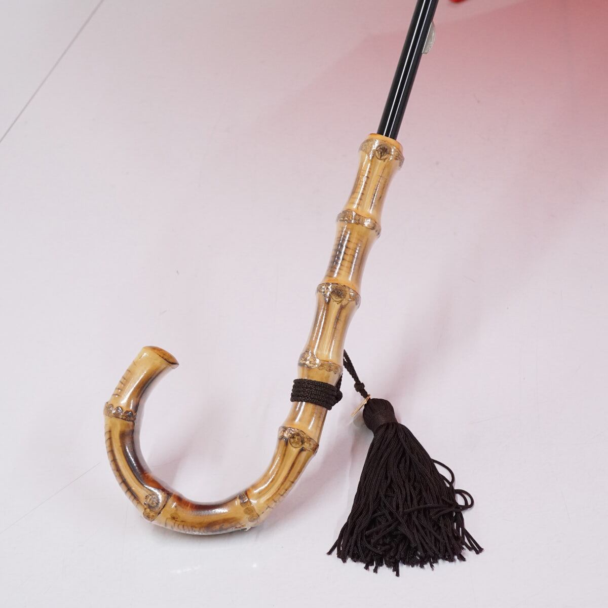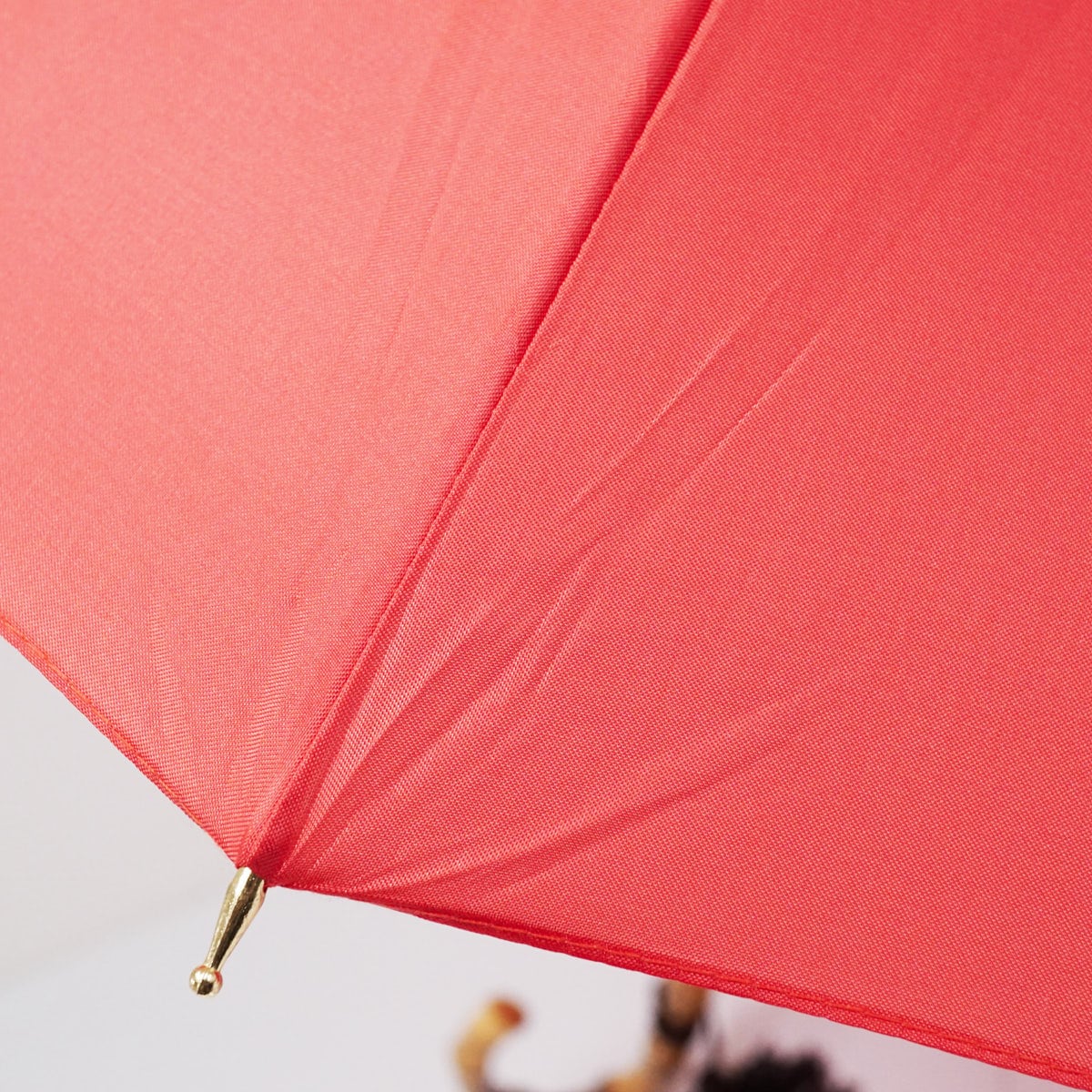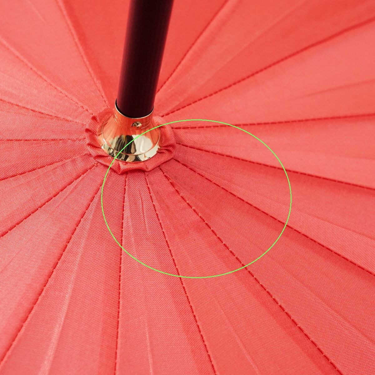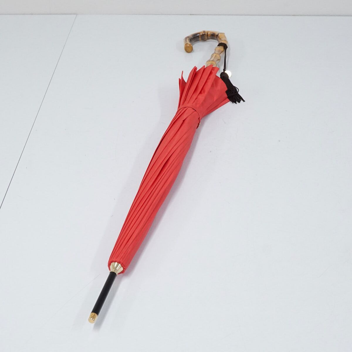 ポピーレッド系の光沢生地を使い、シンプルでありながら16本骨が作り出す円を描くフォルムが麗しい逸品です。