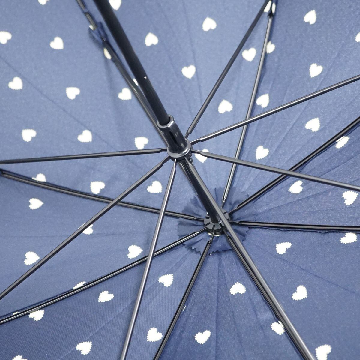 ネイビーの生地に小ぶりなハートの柄が