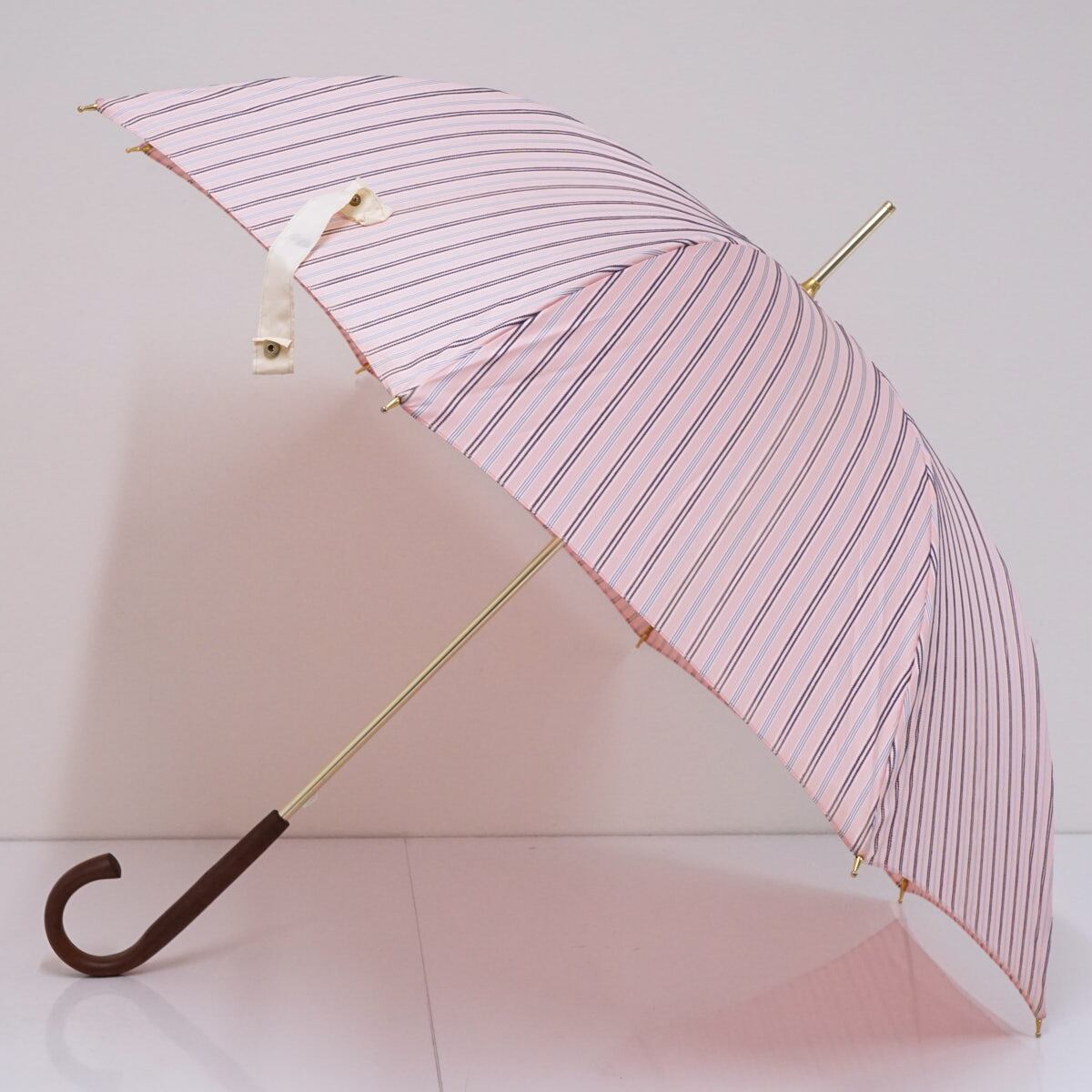 ピンクの生地にストライプラインとロゴ刺繍を入れたおしゃれな雨傘です。