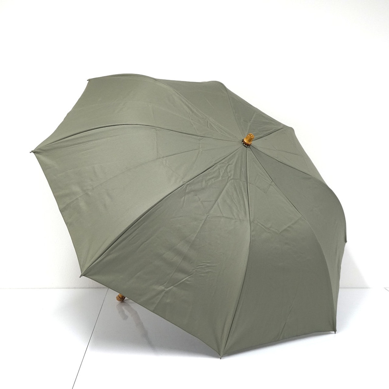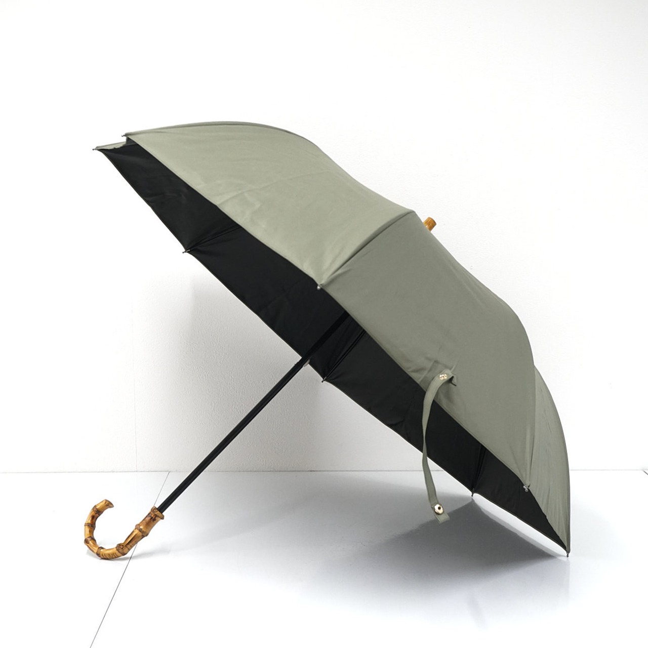 落ち着いたカラーの生地とバンブー素材の手元がナチュラルな雰囲気です。