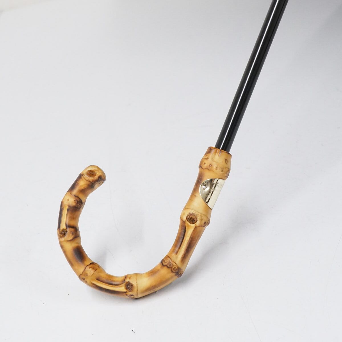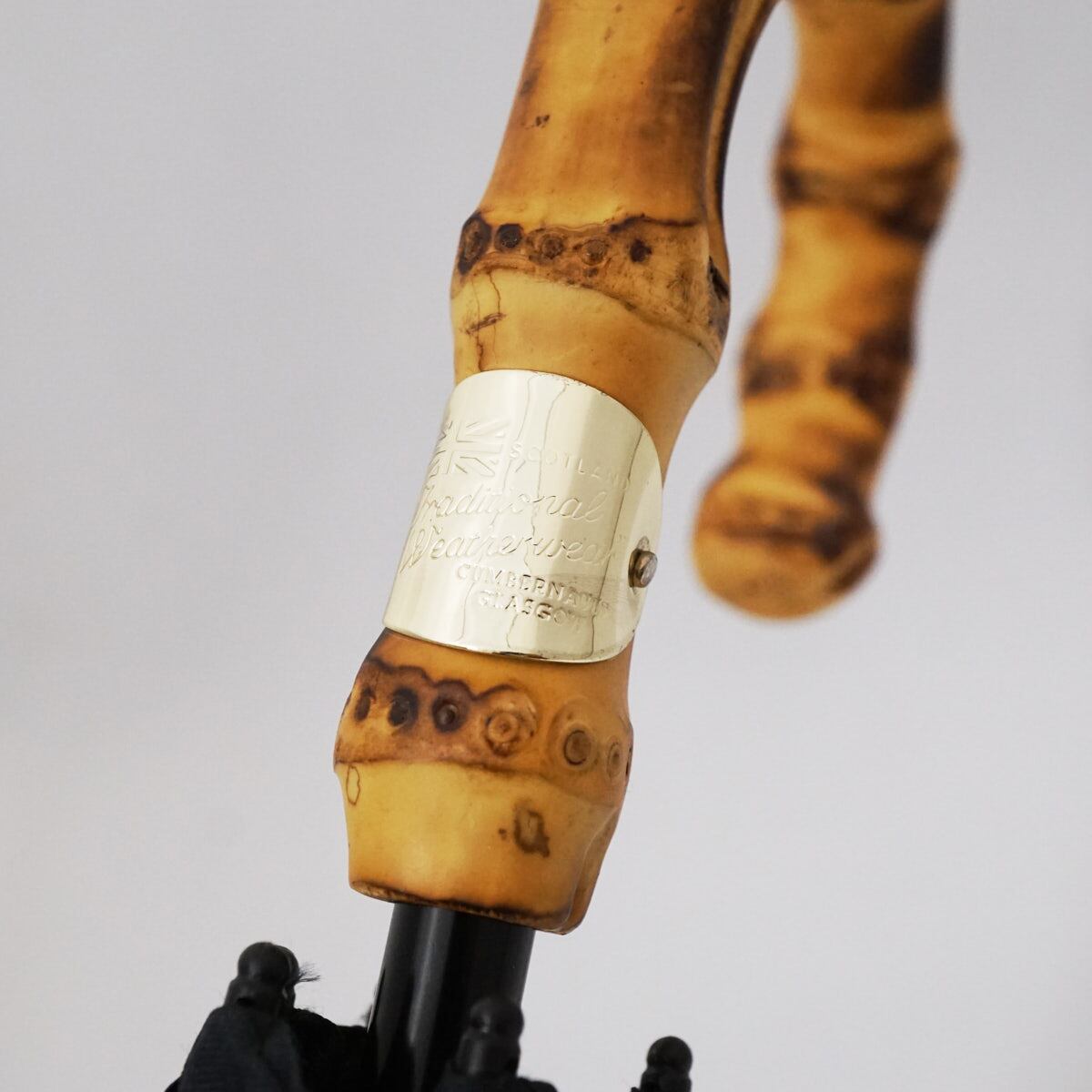 ハンドルと石突には焼き入れした寒竹を使用。ロゴプレートもデザインされ、高級感・ブランド感が感じられます。