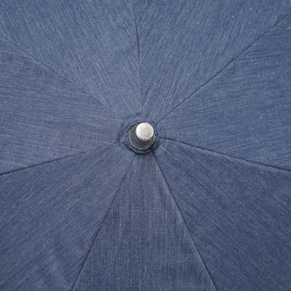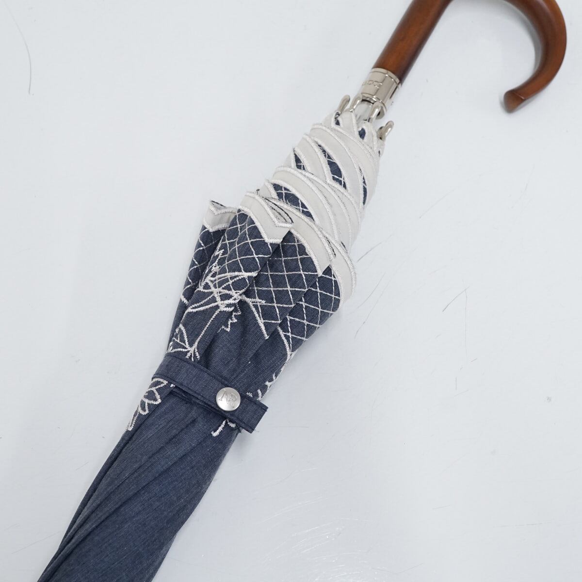 デニムブルーの生地にフラワーや格子などの刺繍で縁取った可愛らしいデザインの日傘です。