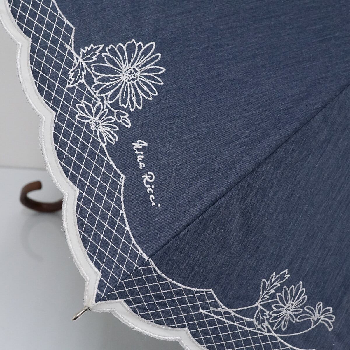 晴雨兼用日傘 NINA RICCI ニナリッチ USED美品 サマーシールドLII 刺繍 デニム ブルー UV 遮光 遮熱 グラス骨 50cm S2416