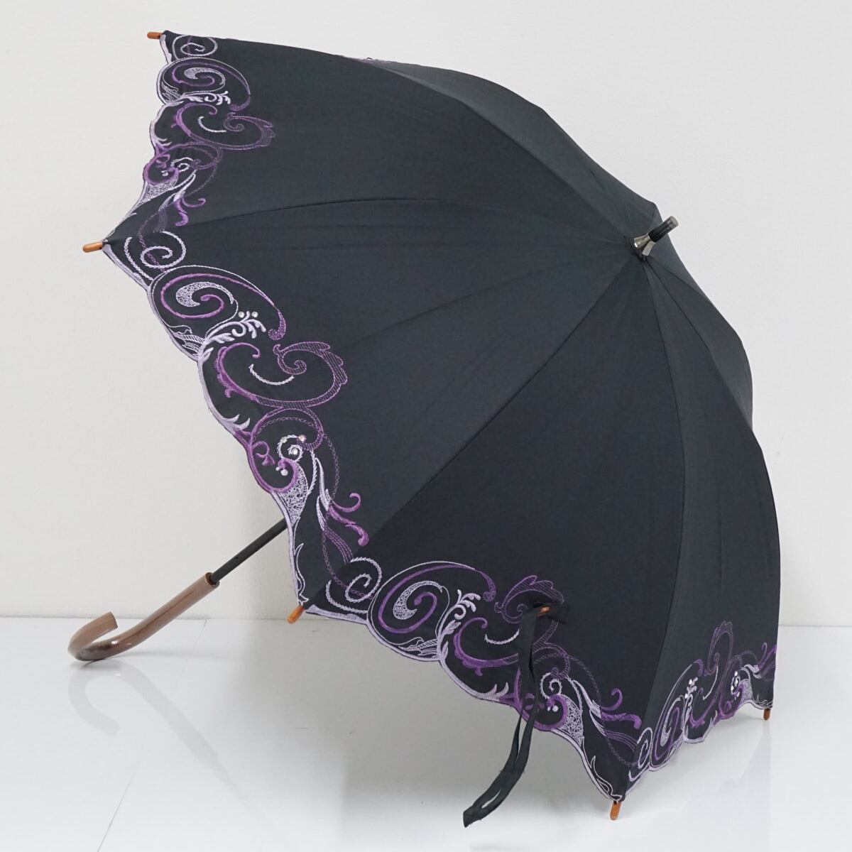 ペイズリーモチーフの刺繍とクリスタルを組み合わせたデザインがオリエンタルな雰囲気のパラソルです。