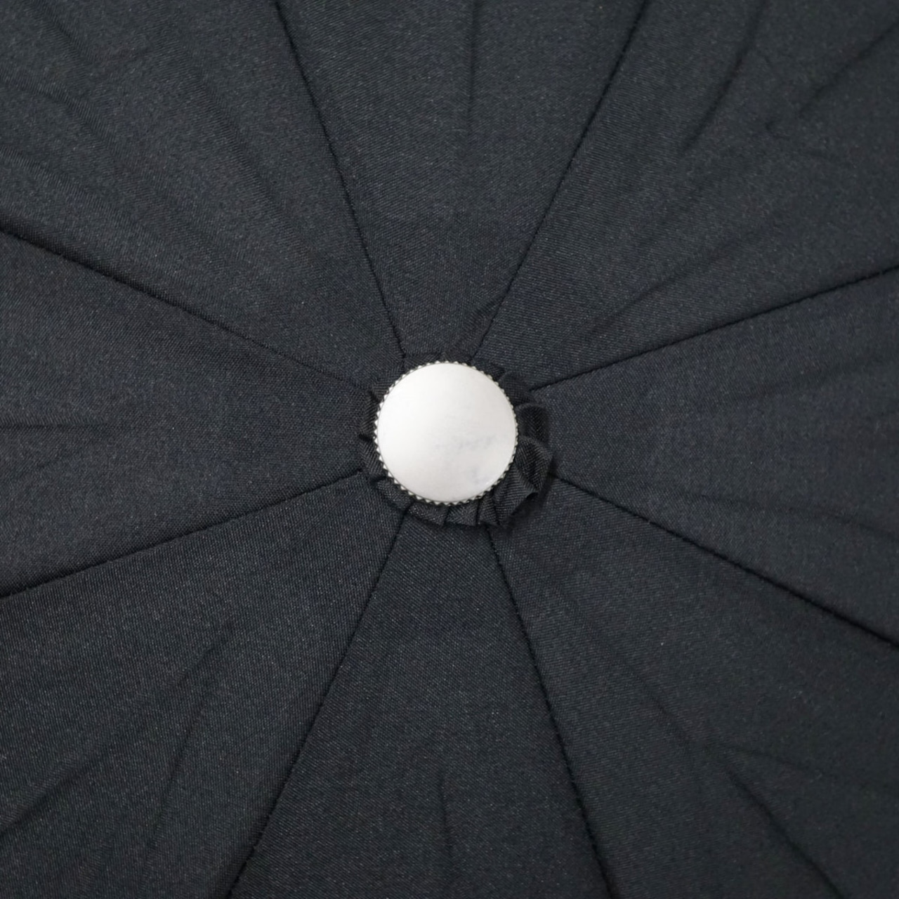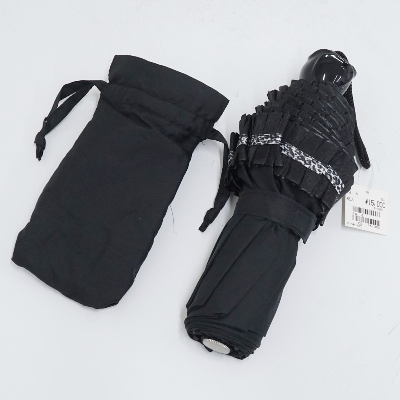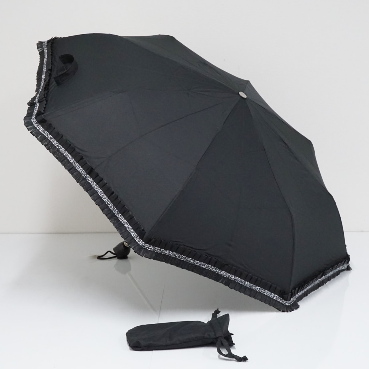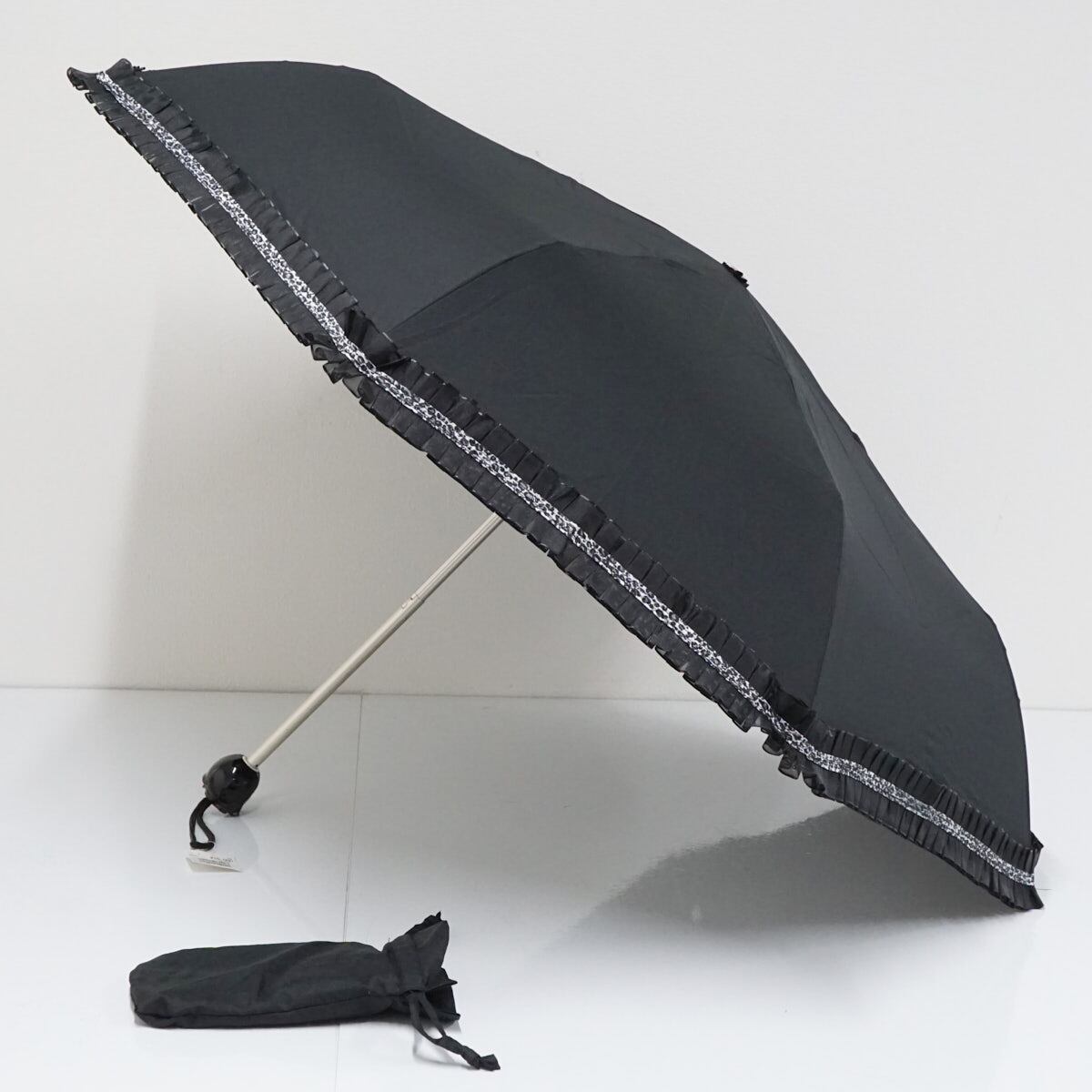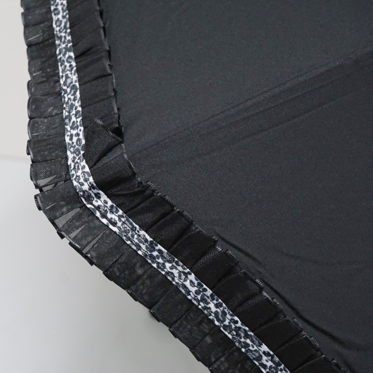 ブラックの生地に縁をフリルとレオパードのテープで華やかなデザインにした、折りたたみ傘です。