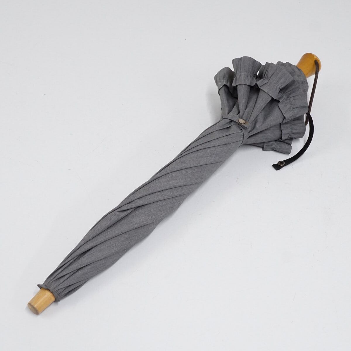 生地のカラーは人気のフロストグレーで、外周にあしらったフリルがフェミニンな雰囲気です。