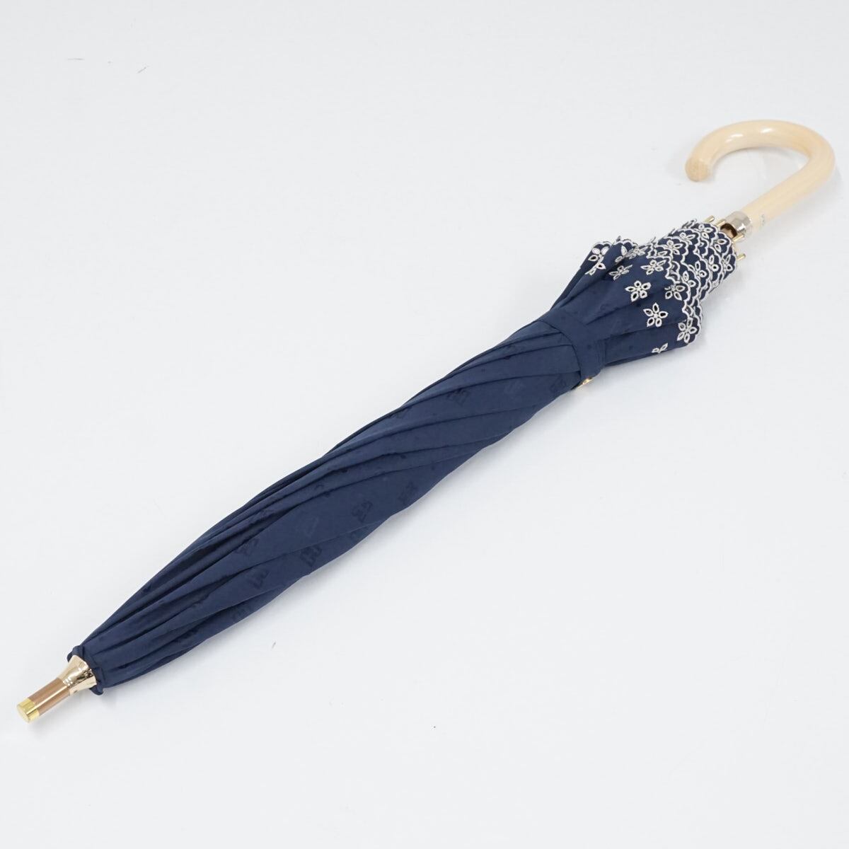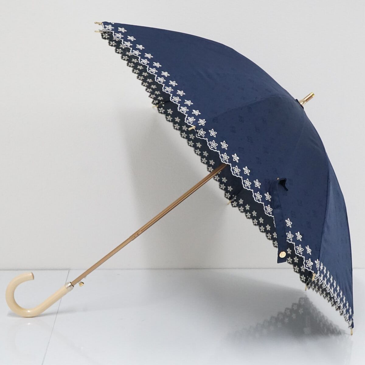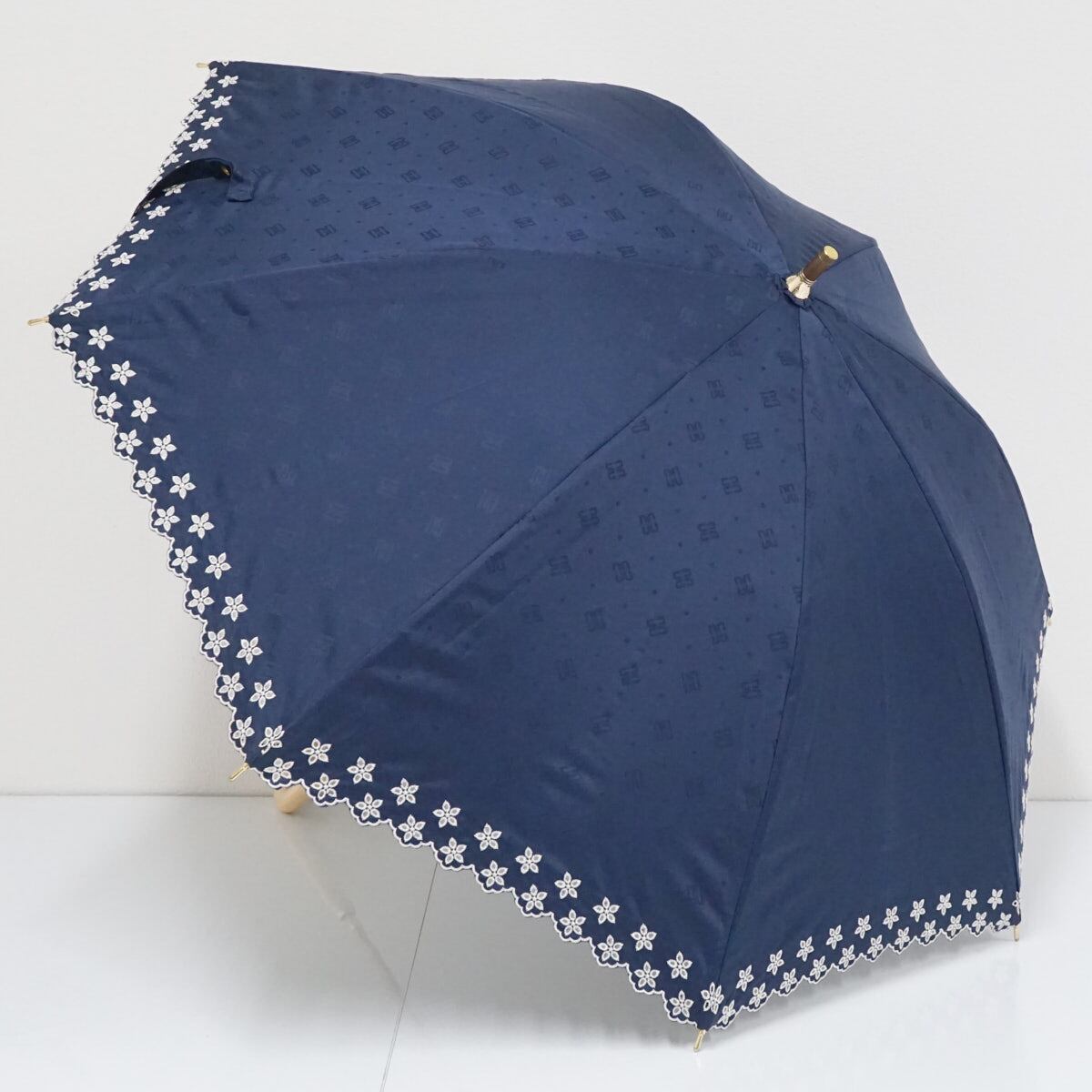 日傘 晴雨兼用 DAKS ダックス USED美品 ネイビー スカラップ フリル 刺繍 ロゴ ドット ジャンプ UV 遮光 47cm A2478