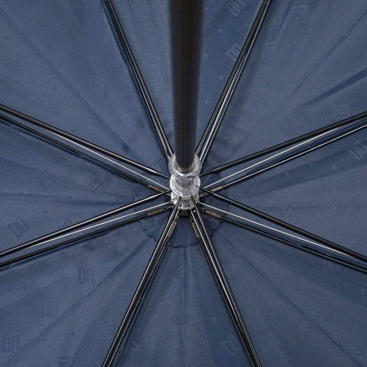 ネイビーの生地に外周のスカラップフリルと「DAKS」を象徴するロゴのプリントが上品な晴雨兼用日傘です。