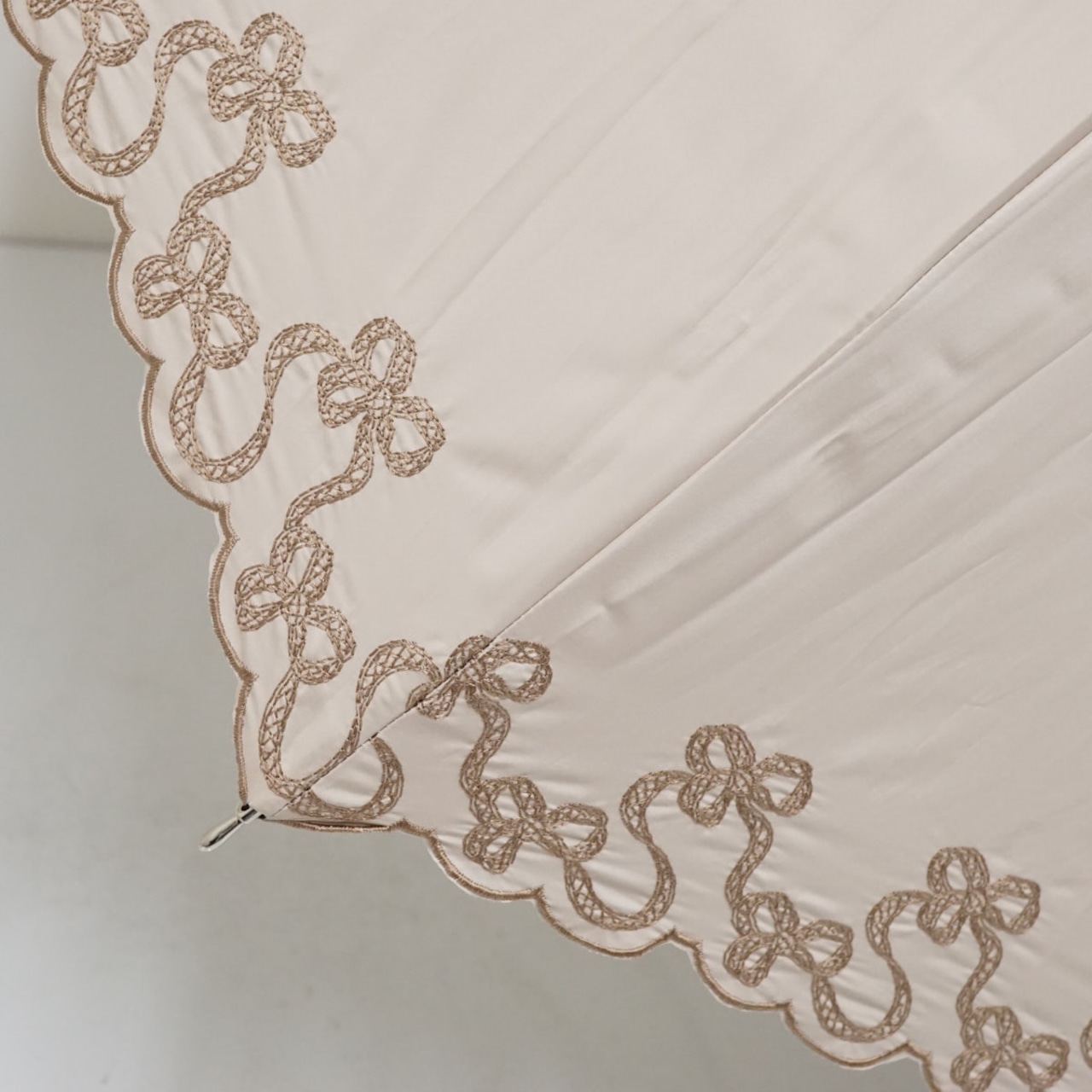 カラーはベージュで、外周を縁取るブラウンのスカラップ刺繍とリボンの刺繍が可愛らしいデザインです。