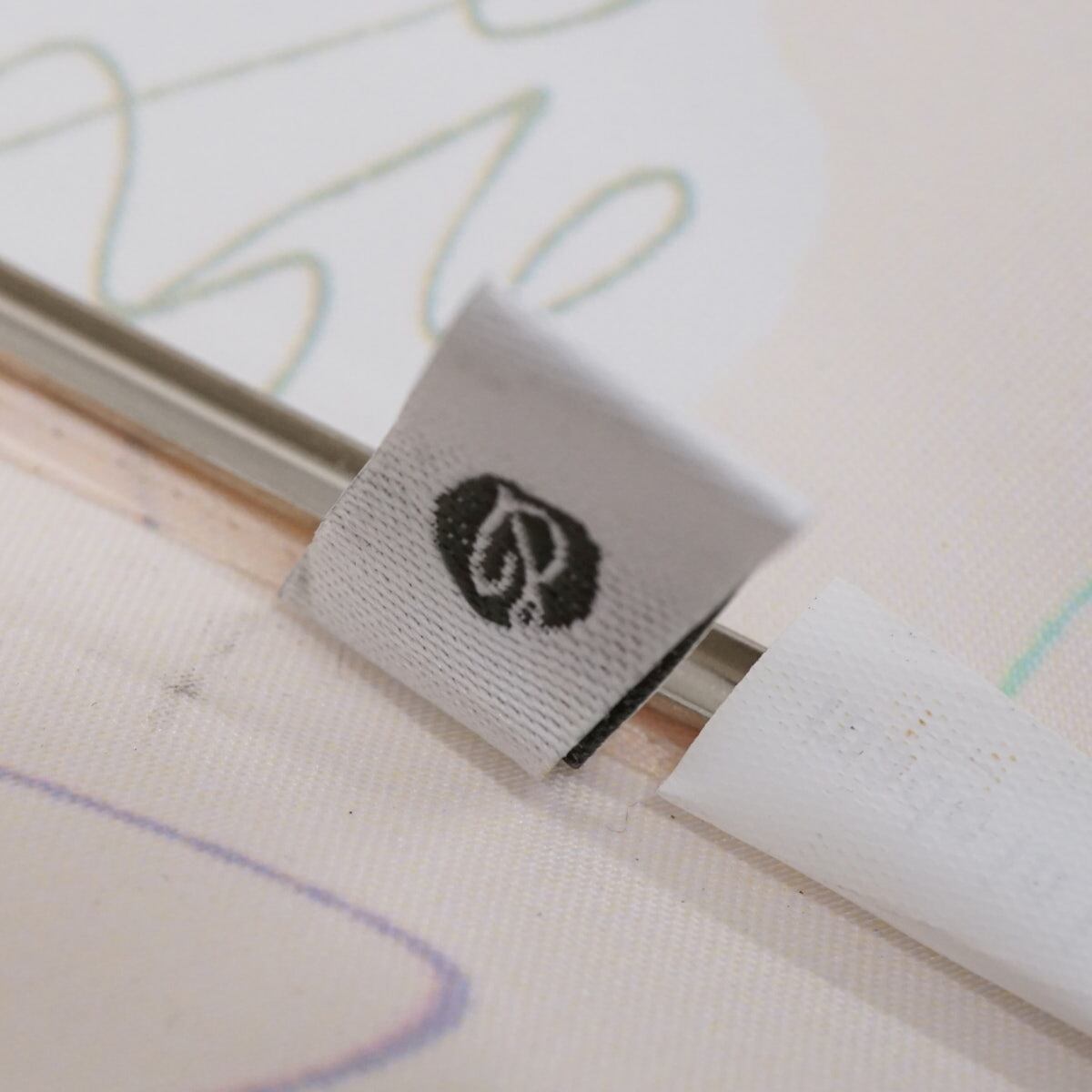 ライトピンクの生地にカラフルなラインのデザインが可愛らしい一品です。