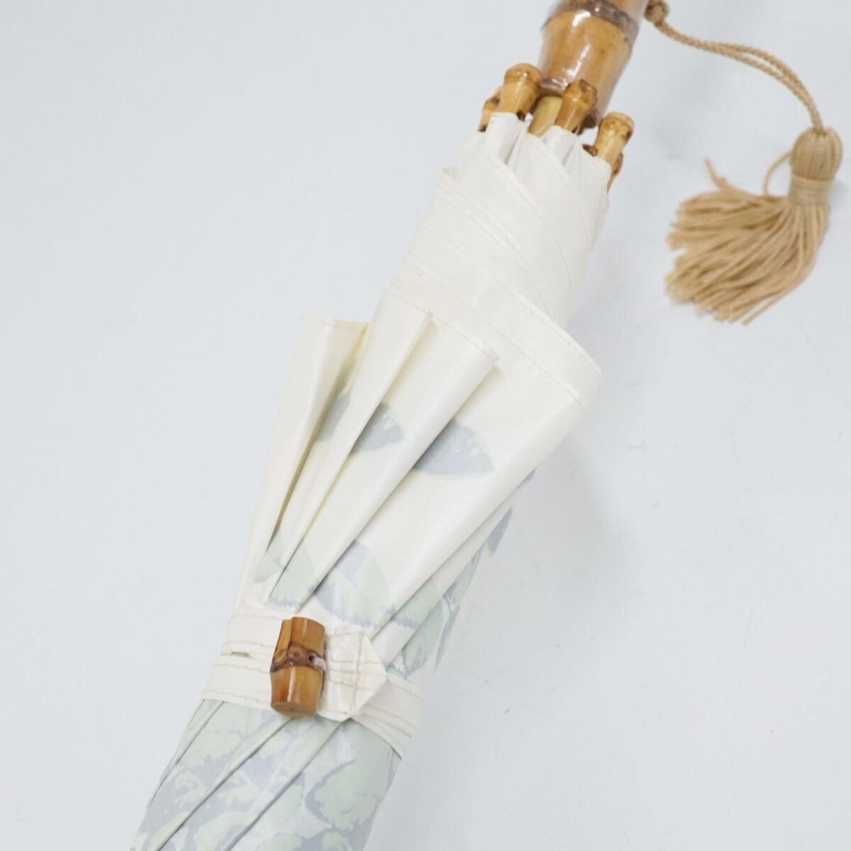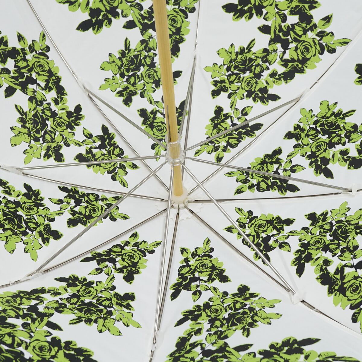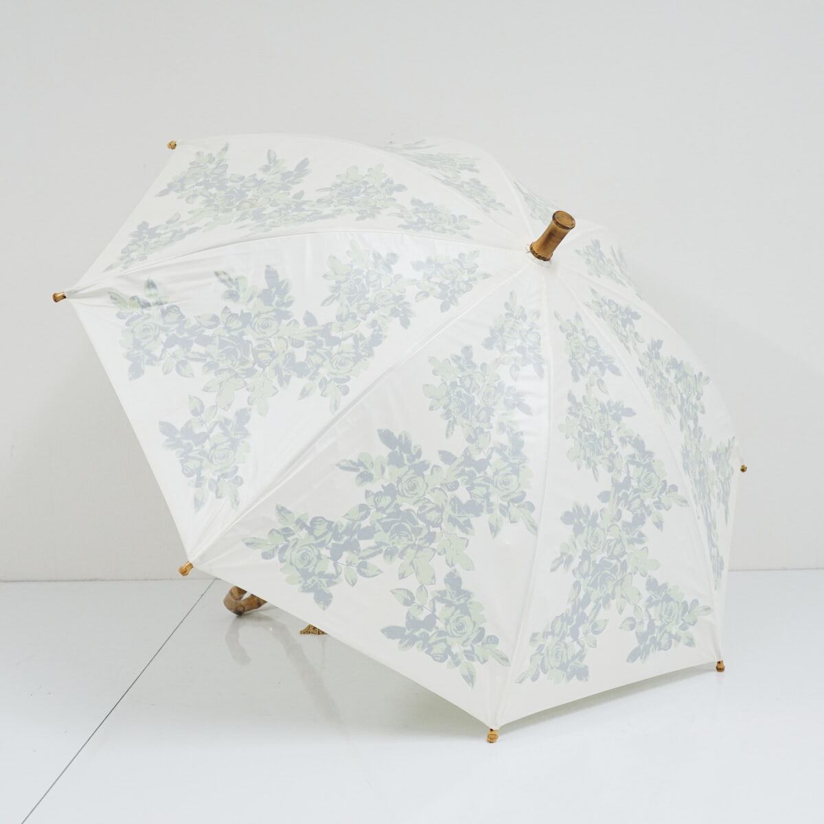 日傘 UVION ユビオン USED品 日本製 プレミアムホワイト パール ローズ柄 グリーン 寒竹手元 晴雨兼用 遮熱 UV 50cm S2494