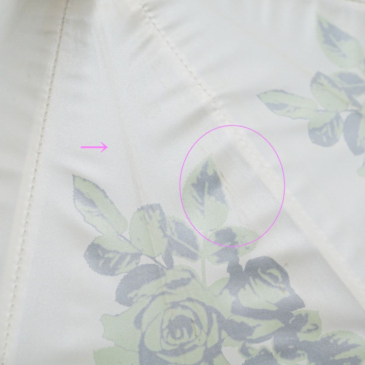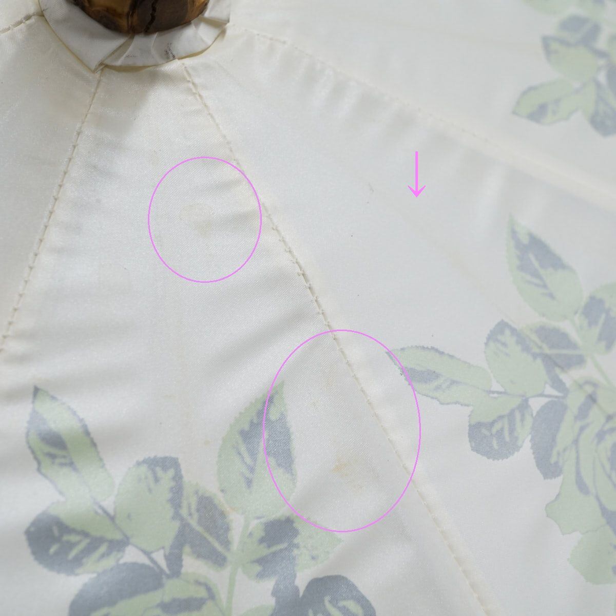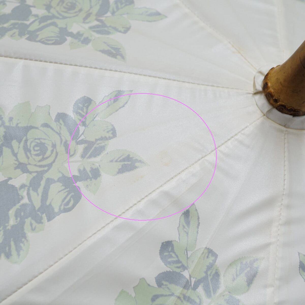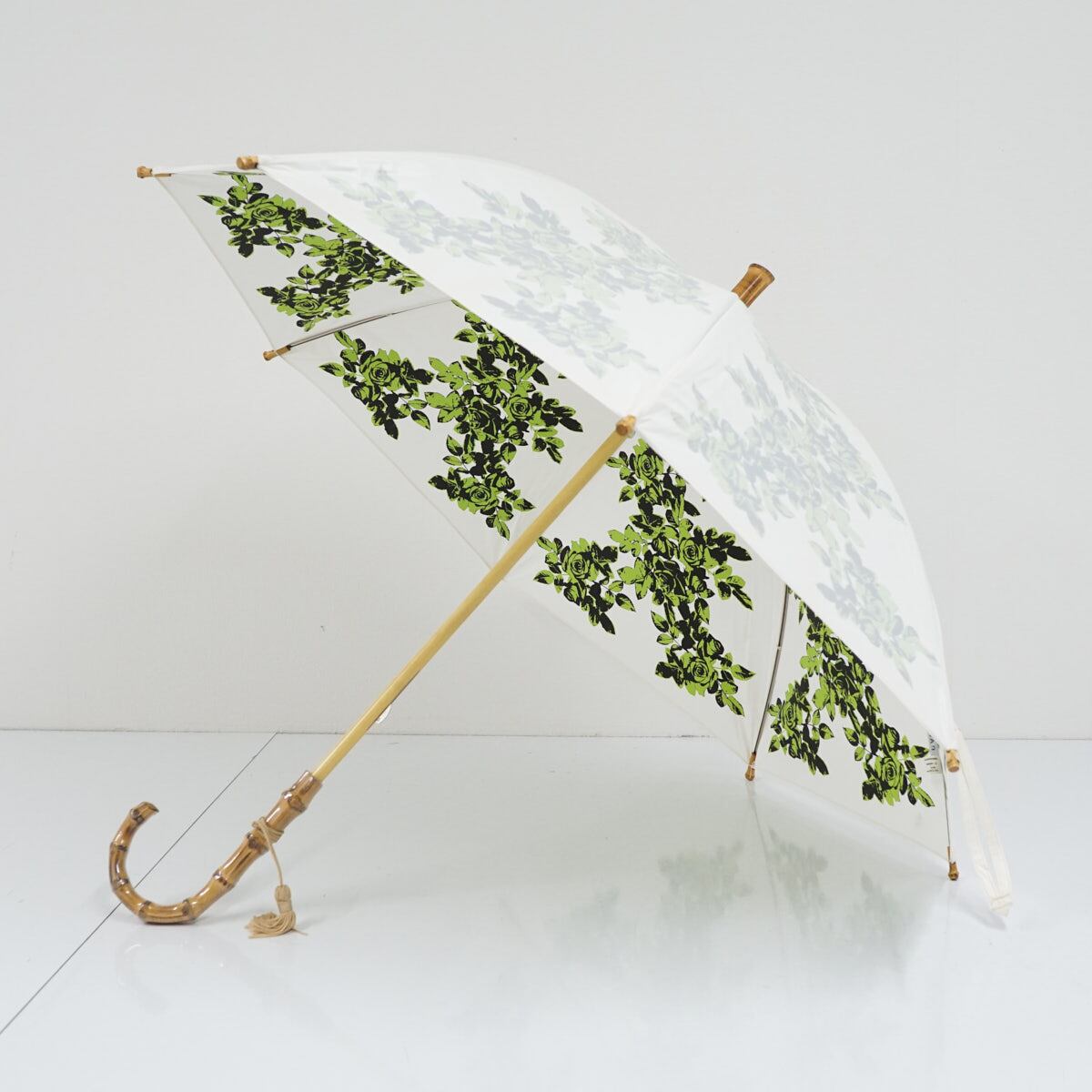 日傘 UVION ユビオン USED品 日本製 プレミアムホワイト パール ローズ柄 グリーン 寒竹手元 晴雨兼用 遮熱 UV 50cm S2494