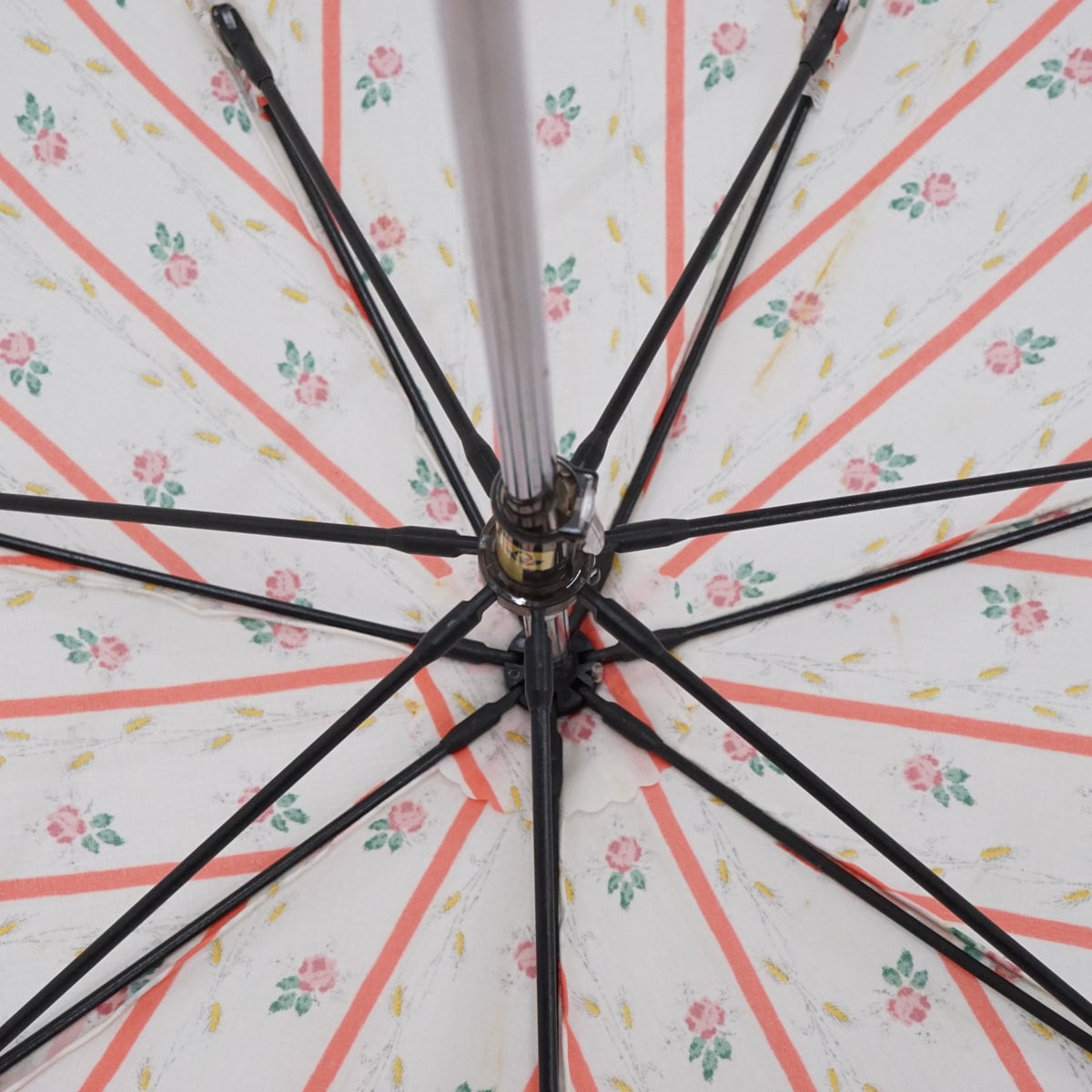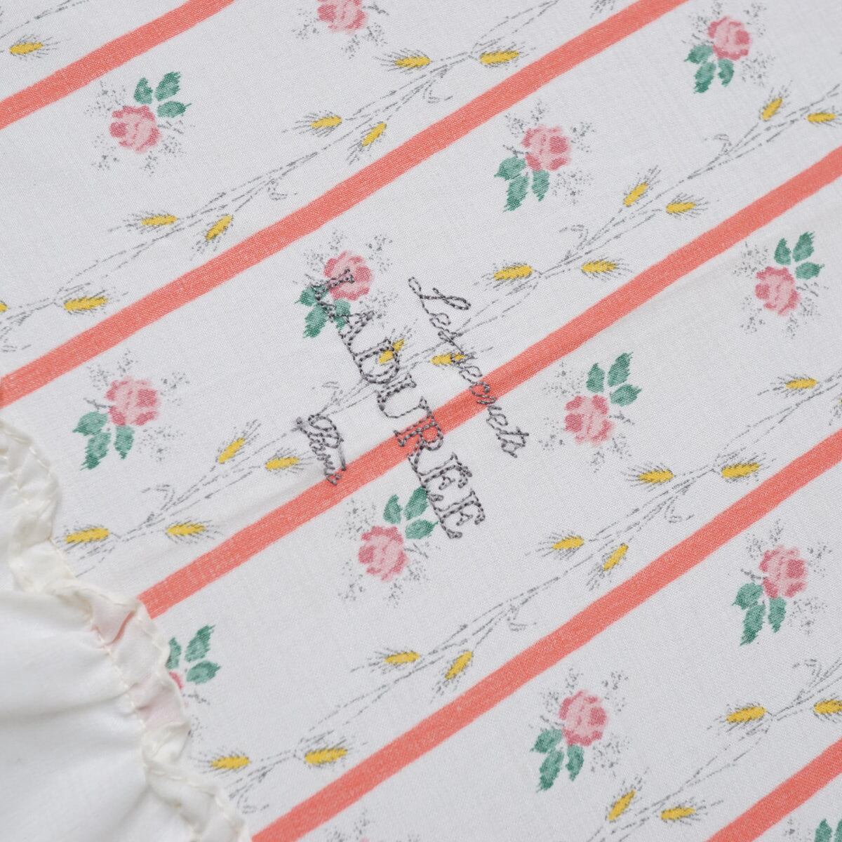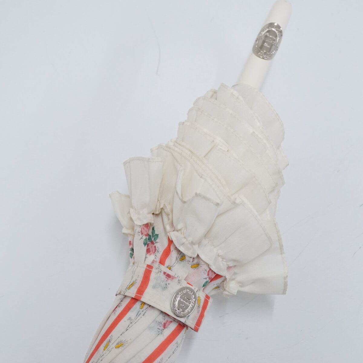 フラワープリント入りのストライプ生地に、縁にはたっぷりのフリルがあしらわれており、とてもかわいいパラソルです。
