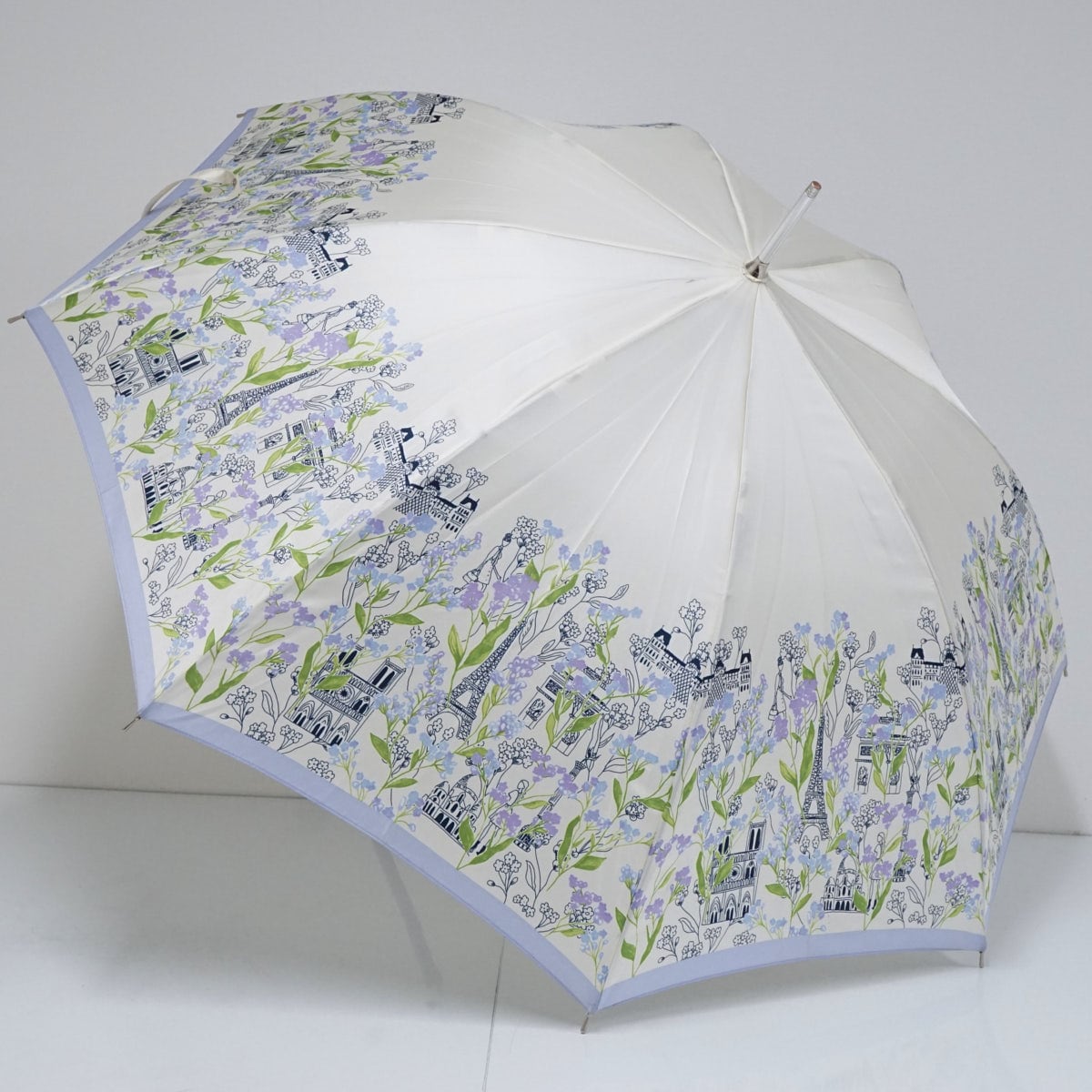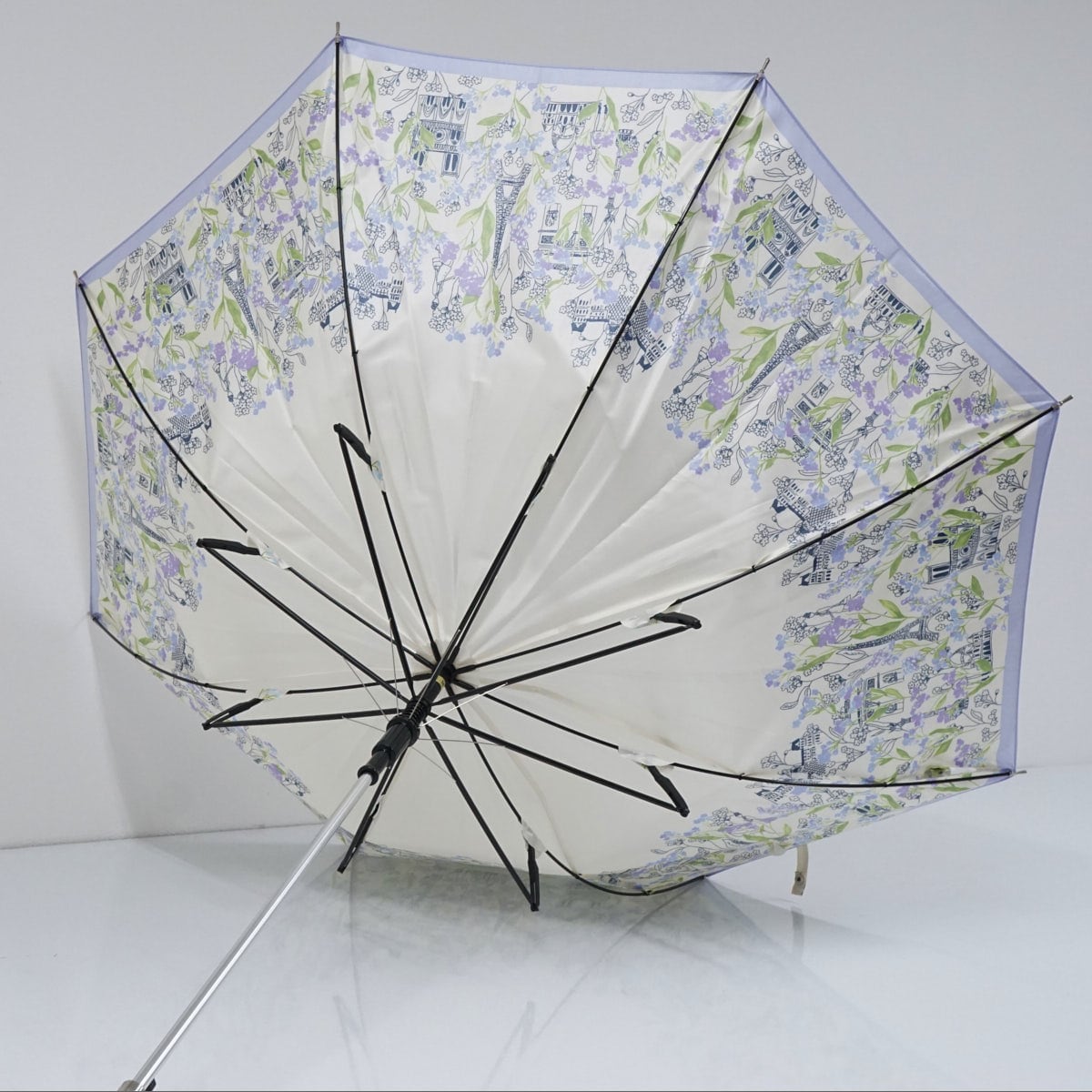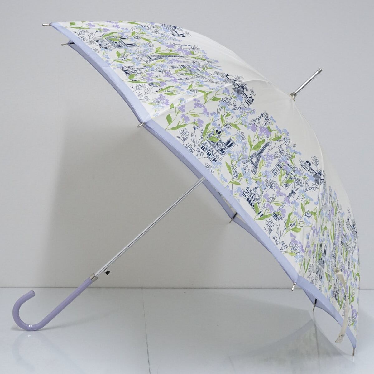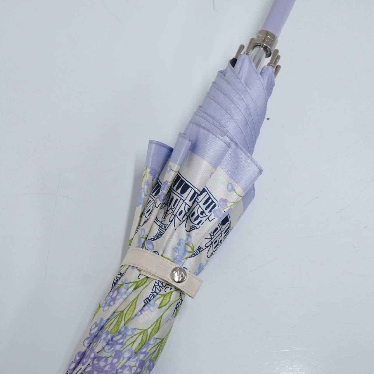 耐風傘 NINA RICCI ニナリッチ USED品 ライトパープル パリの街並み イラスト フラワープリント かわいい ジャンプ グラス骨 60cm A2526