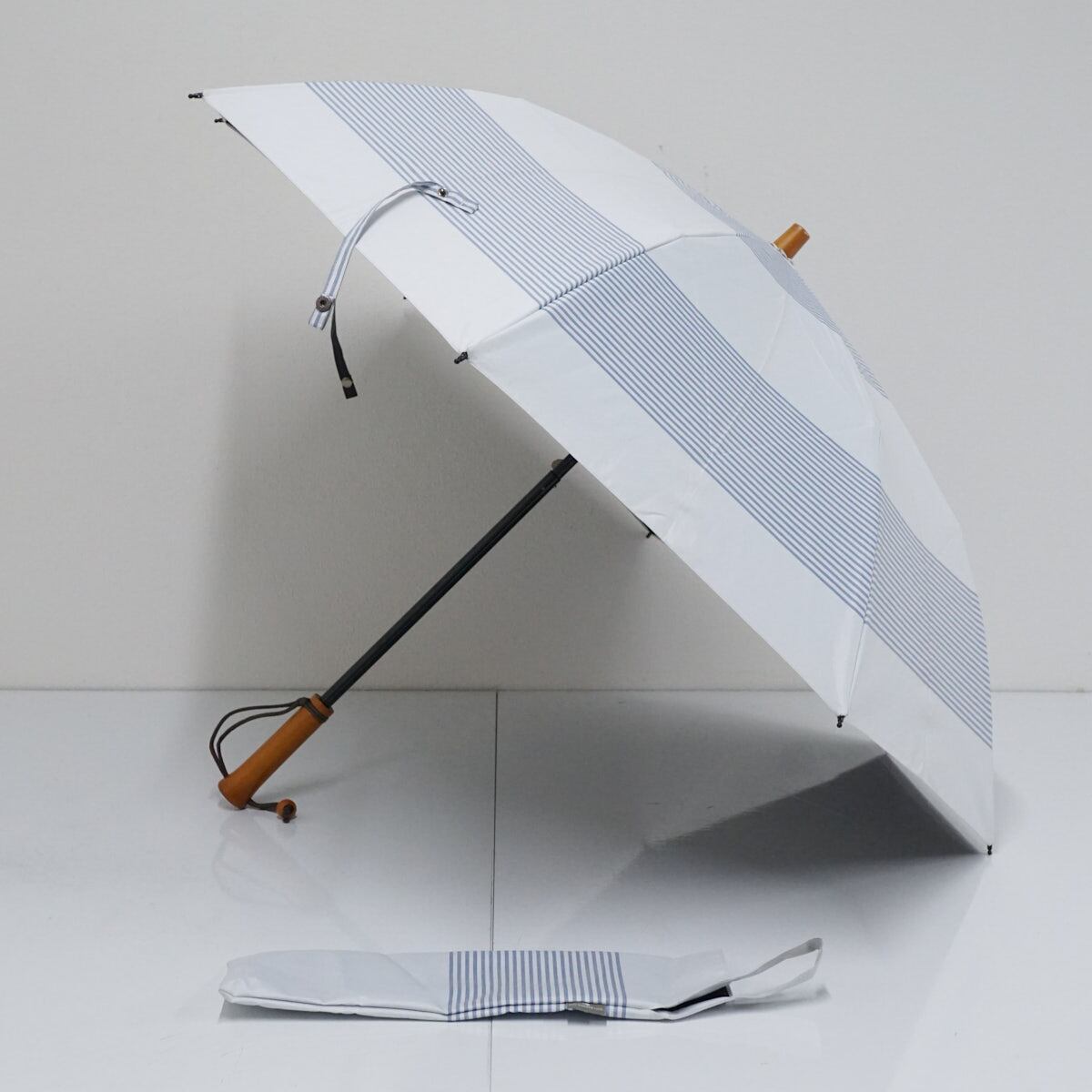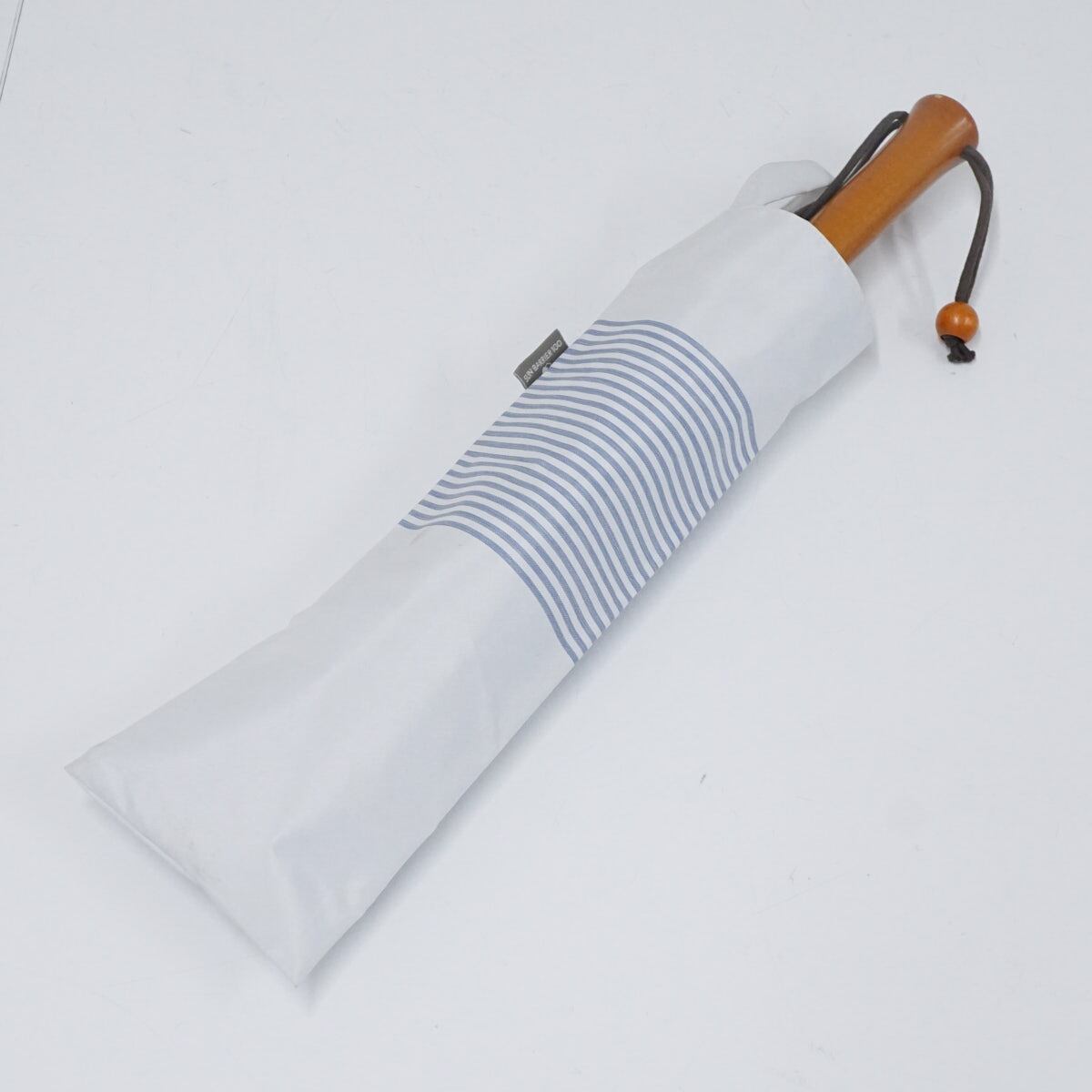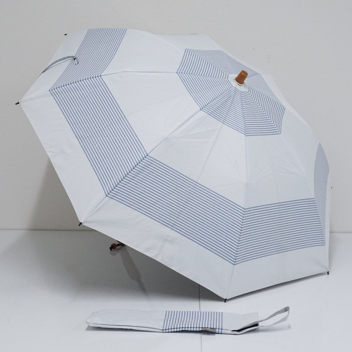 日傘 サンバリア100 完全遮光折日傘 USED品 2段折 ボーダー ホワイト ブルー 2WAY 折りたたみ傘 UV 遮熱 50cm FS8960