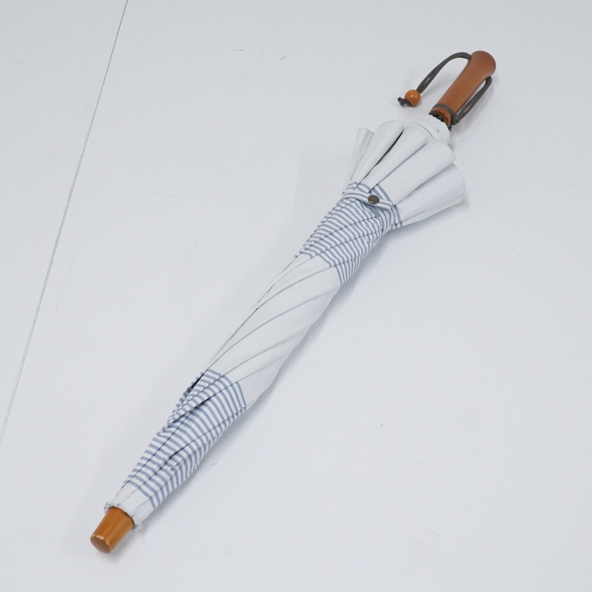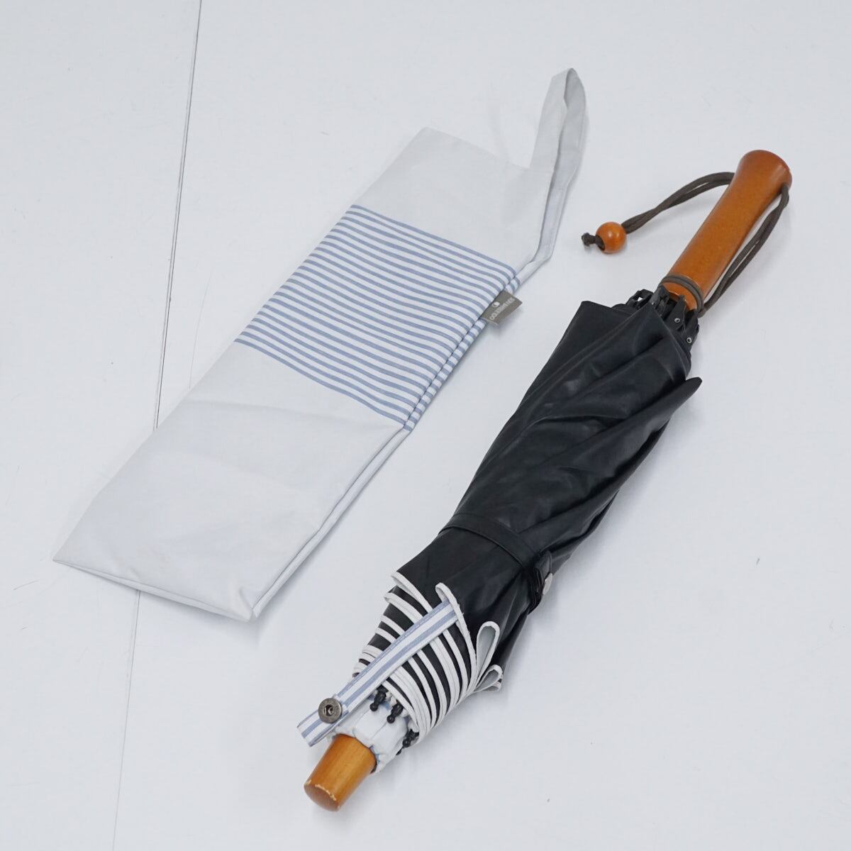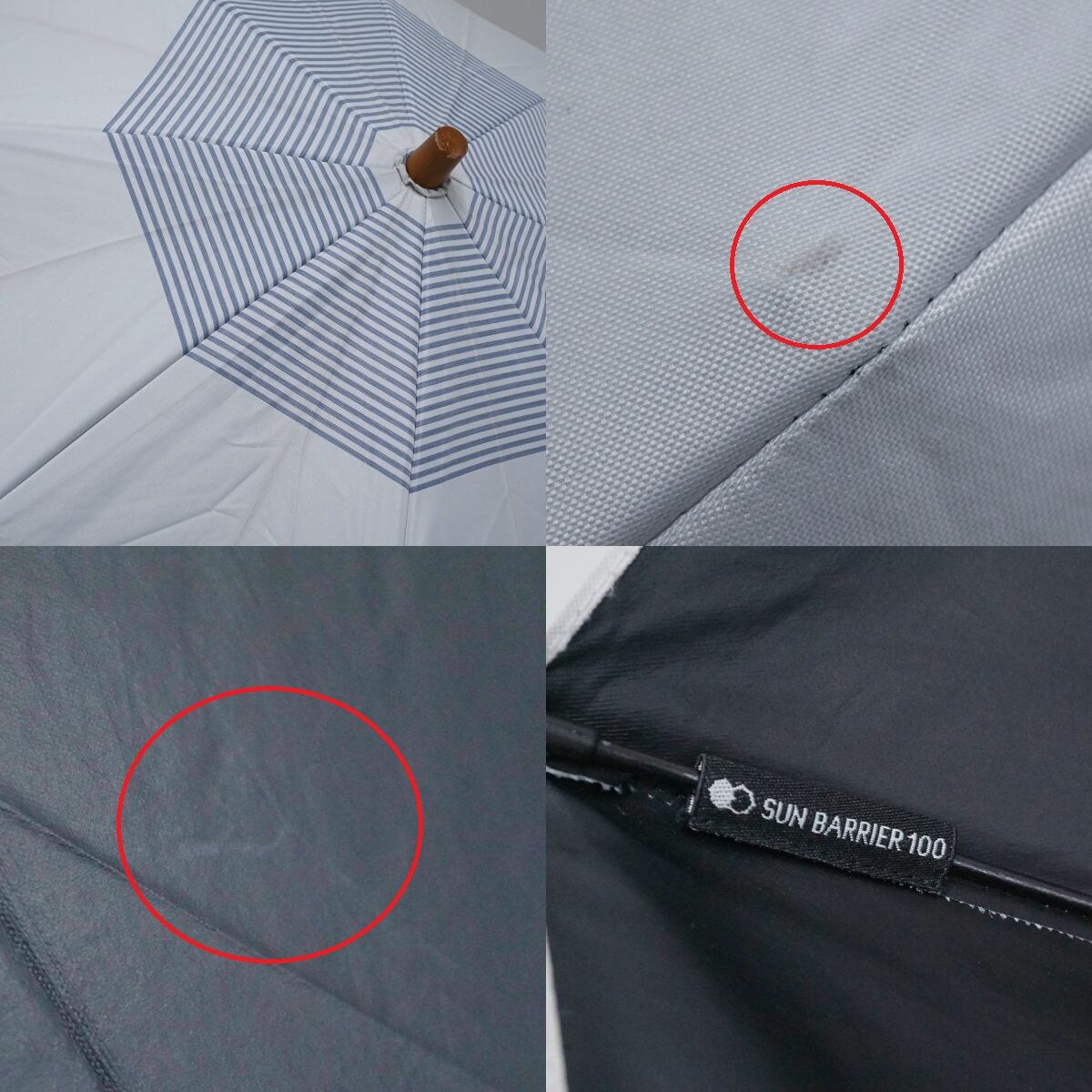 日傘 サンバリア100 完全遮光折日傘 USED品 2段折 ボーダー ホワイト ブルー 2WAY 折りたたみ傘 UV 遮熱 50cm FS8960