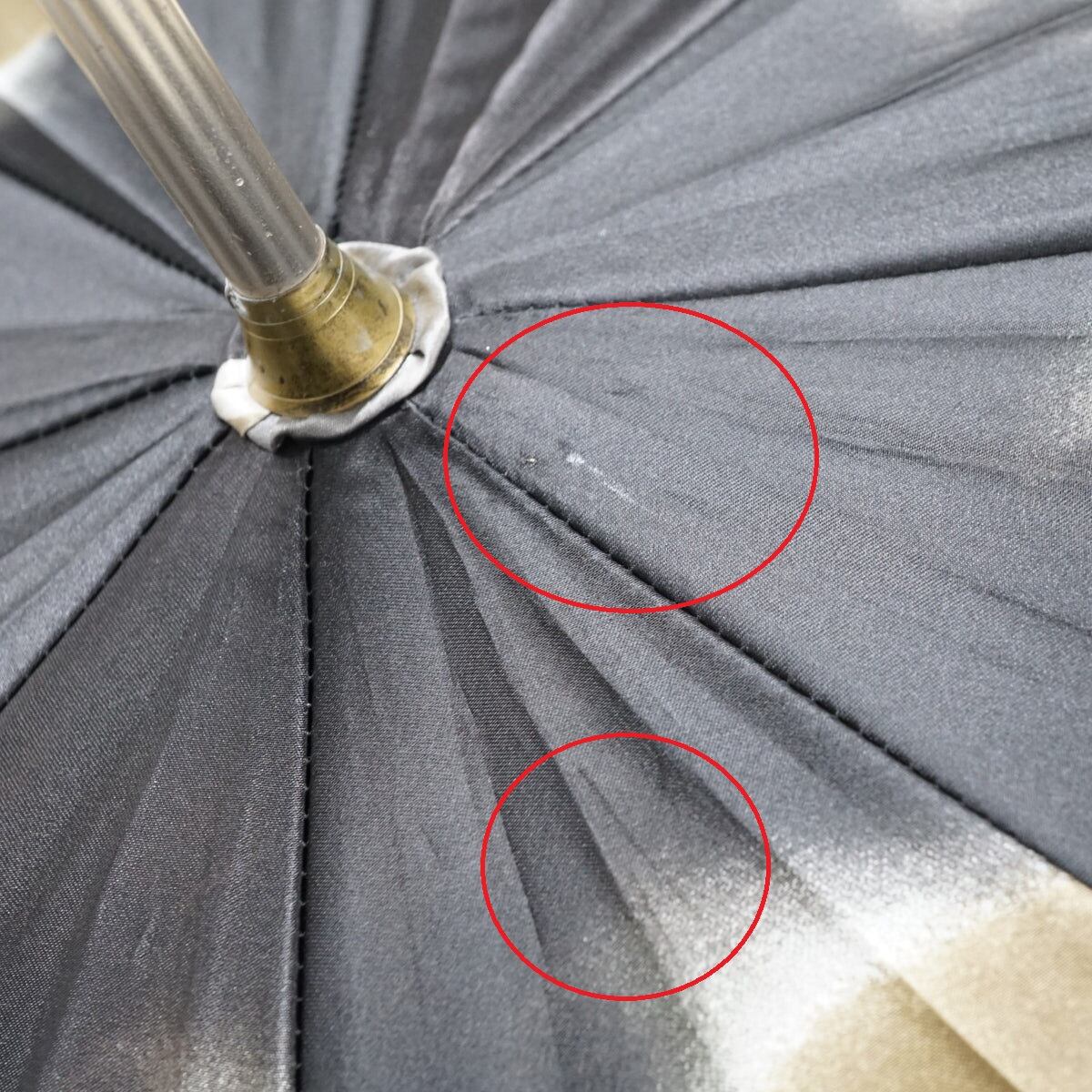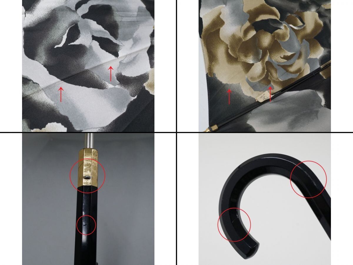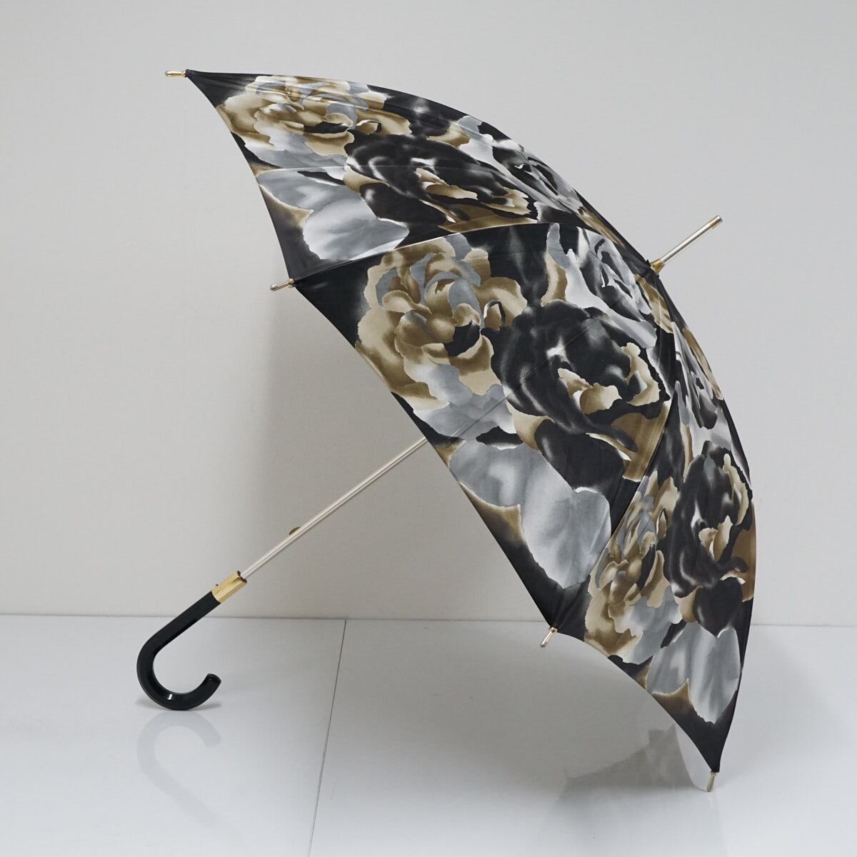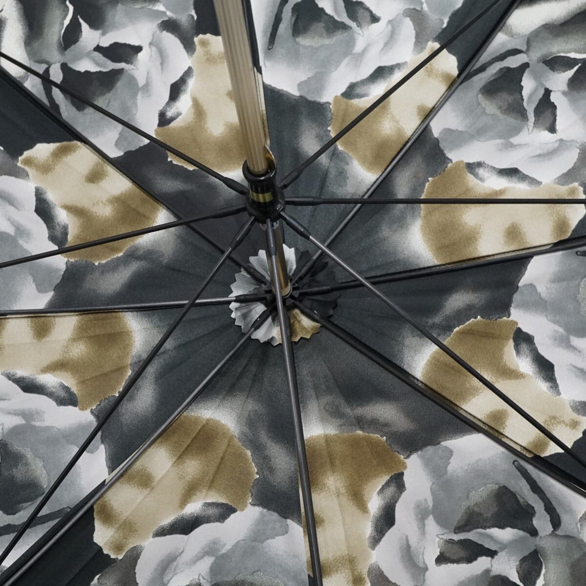 生地の光沢が美しく、大きくエレガントな薔薇柄が傘いっぱいに描かれています。