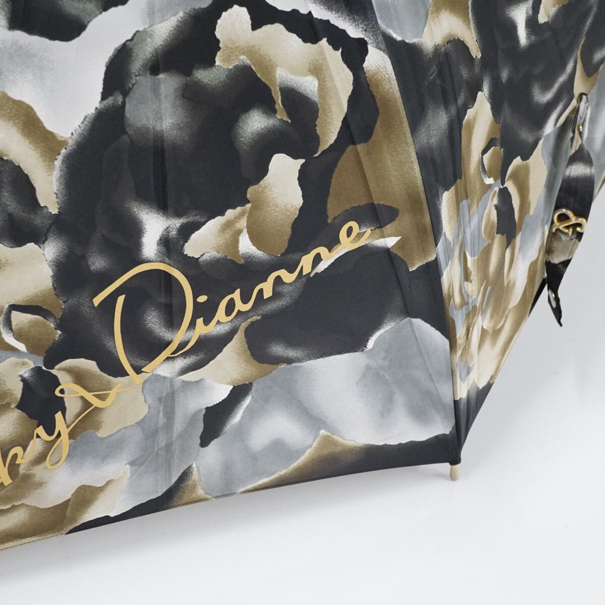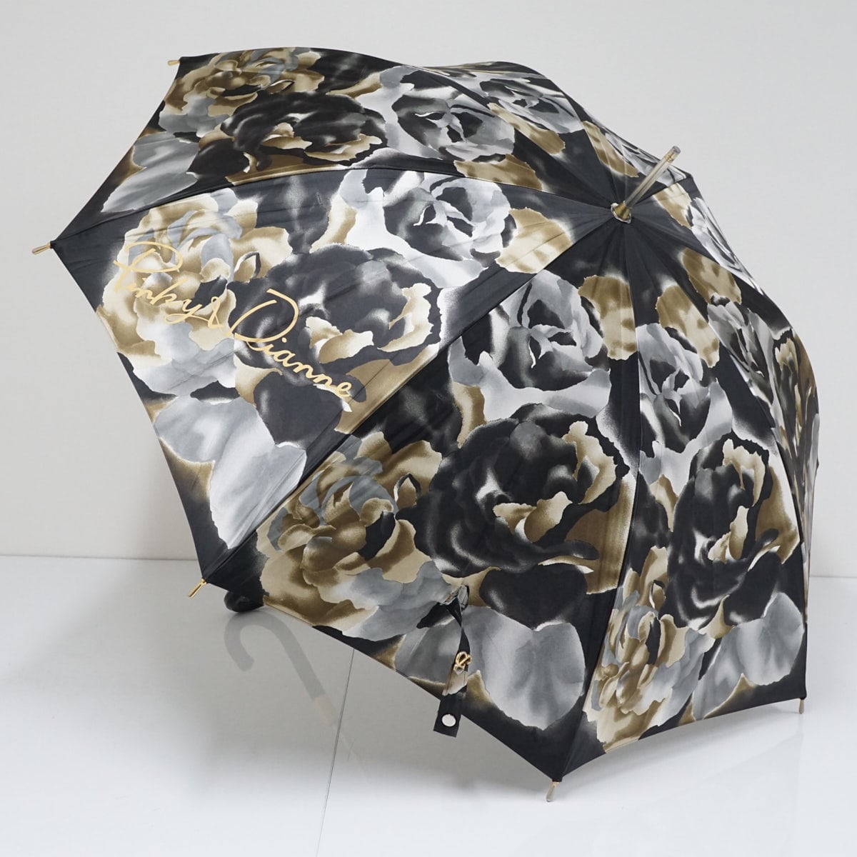 傘 Pinky&Dianne ピンキー&ダイアン USED品 総柄 フラワー 薔薇 ロゴ エレガント 手開き式 ブラック×ゴールド 61cm A2638