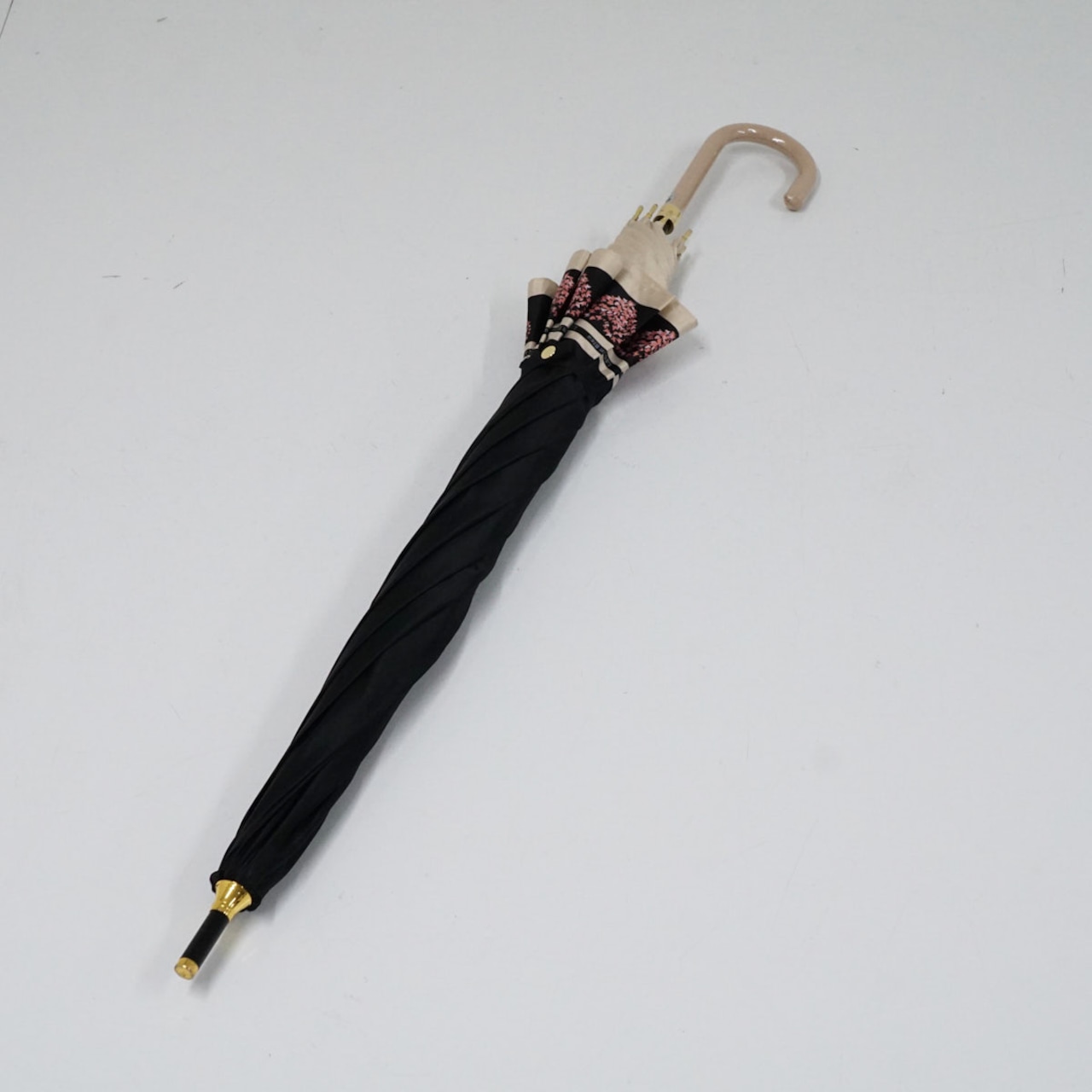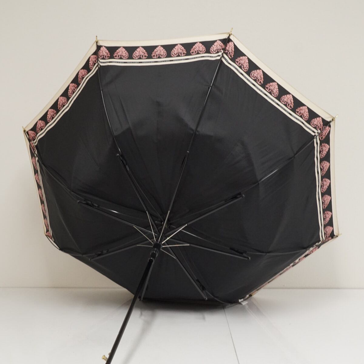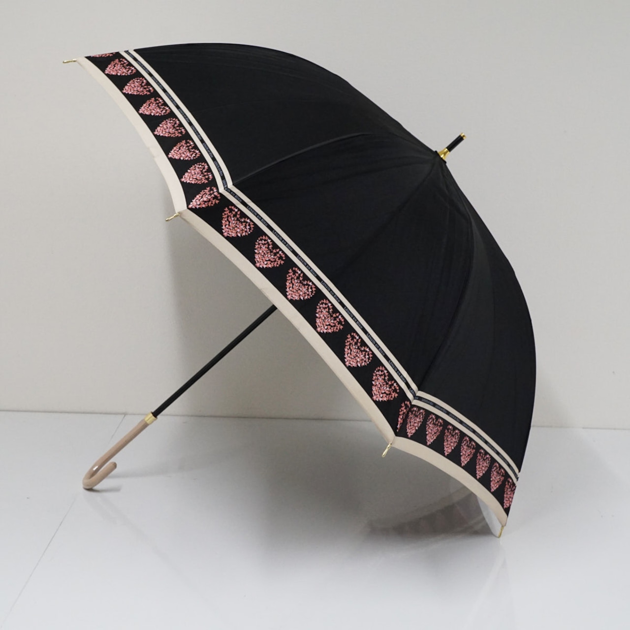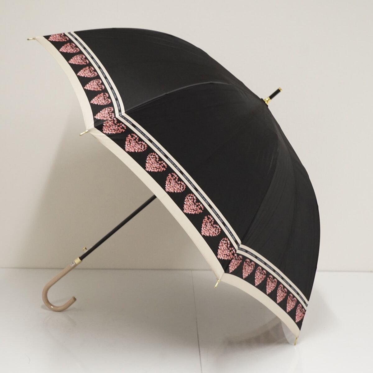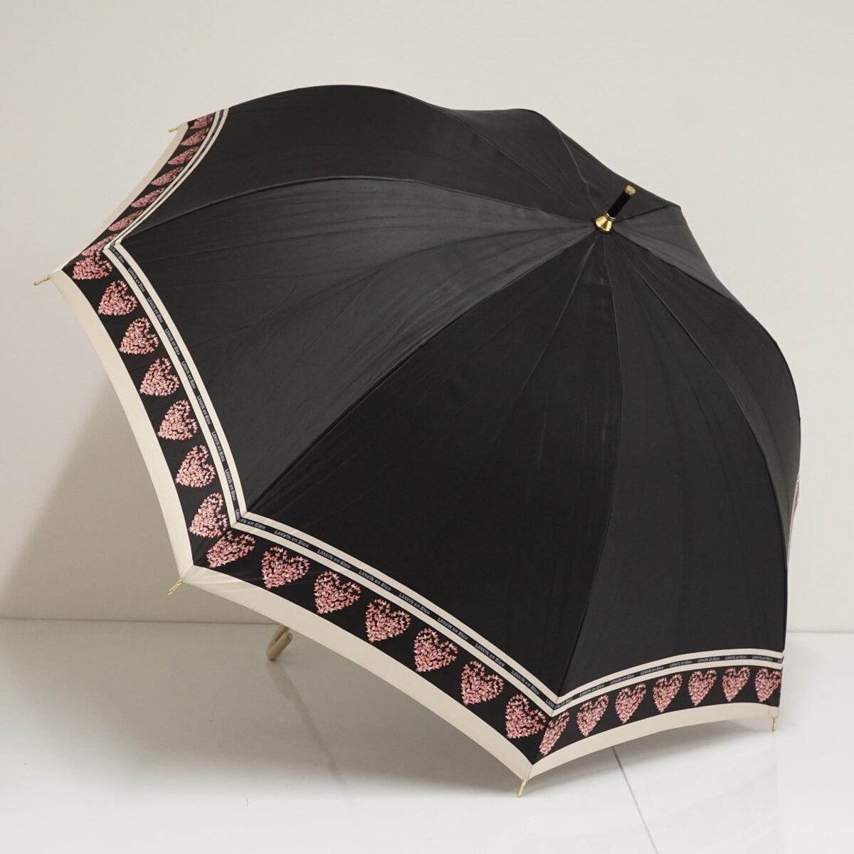 ブラックの生地にピンクのハート柄がかわいい傘です。