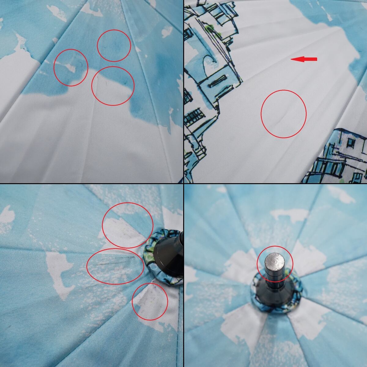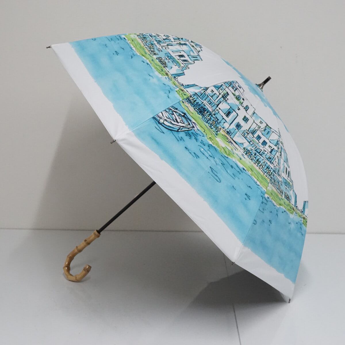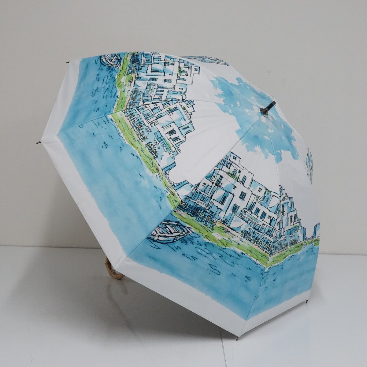 晴雨兼用傘 ソレイユ USED美品 ドーム型 ショート傘 完全遮光 UV バカンス柄 エーゲ海風景 寒竹 50cm A2681
