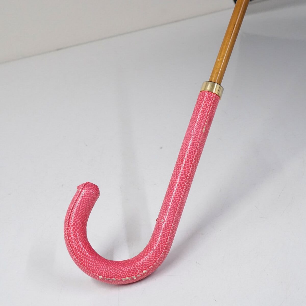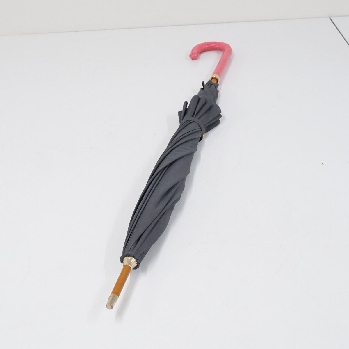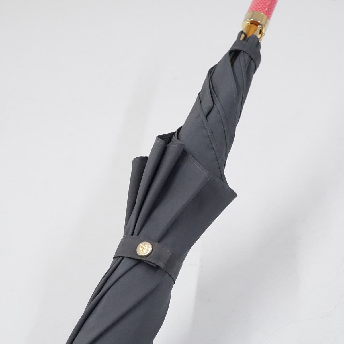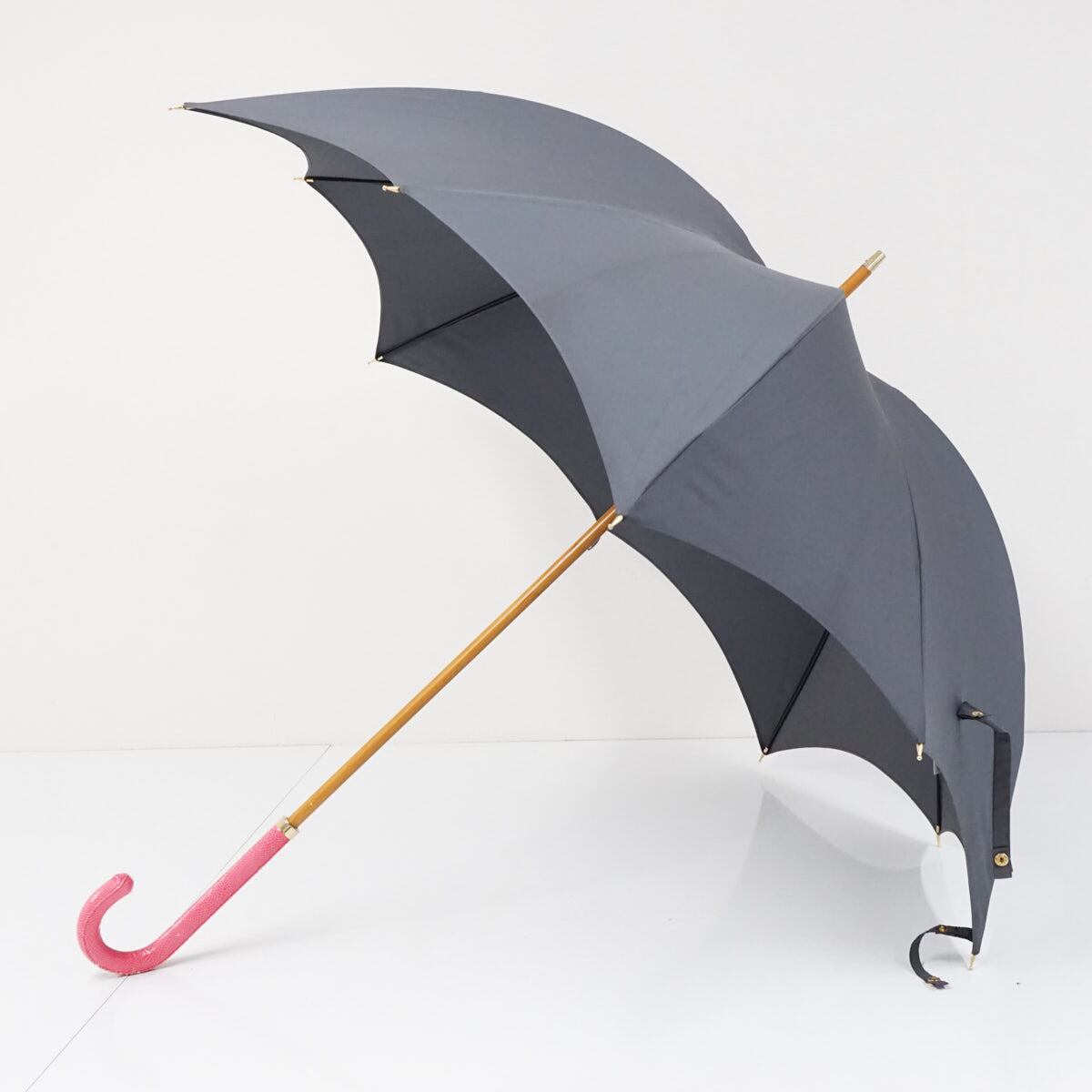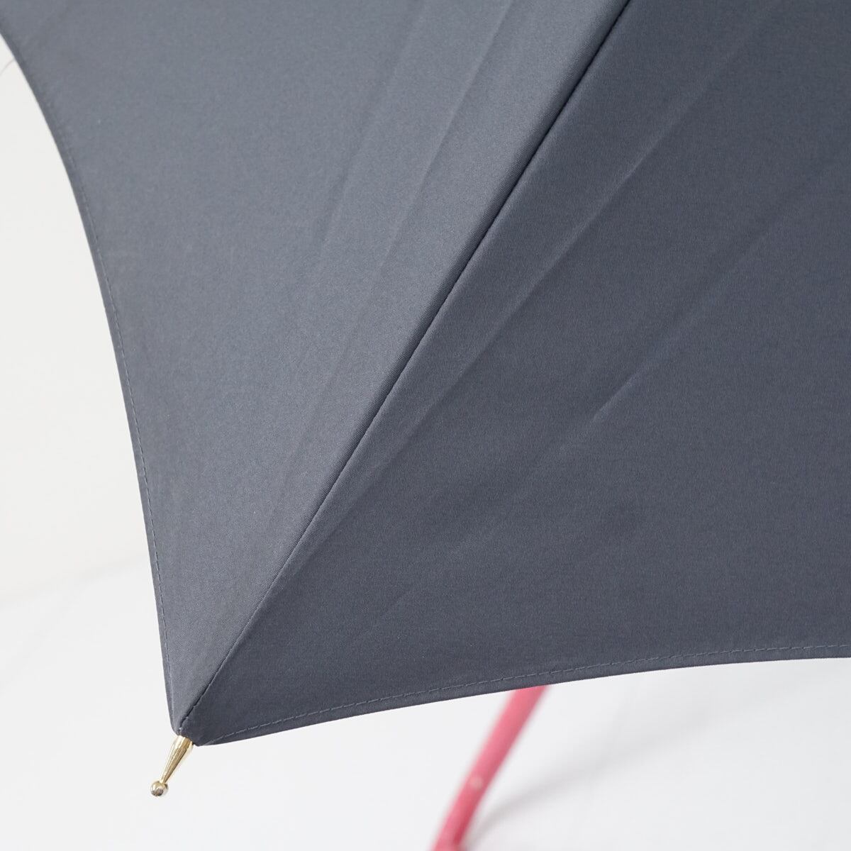 グレーの無地生地をリズミカルなフォルムでデザインし、ピンク系のレザー(合皮)ハンドルを合わせた個性的な一本です。