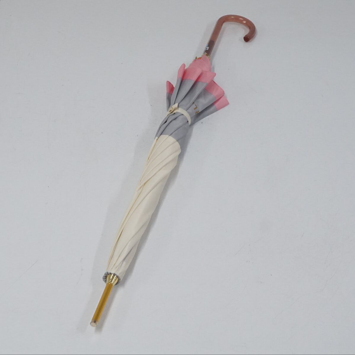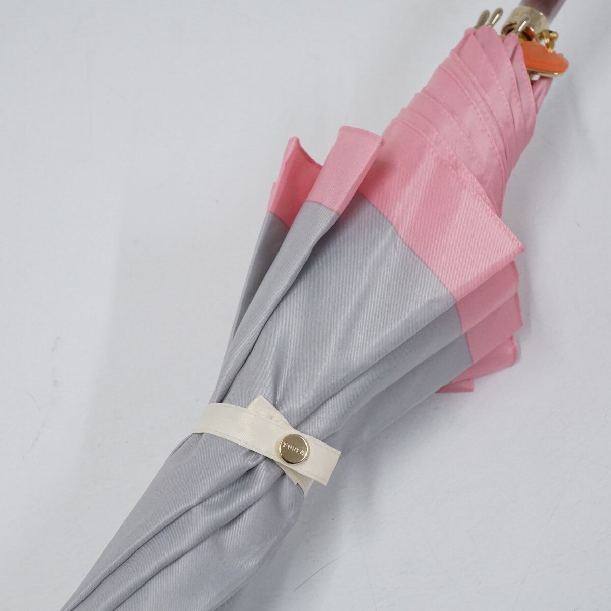 耐風傘 FURLA フルラ USED美品 カラーボーダー ホワイト グレー ピンク ロゴプリント ハートチャーム ジャンプ グラス骨 60cm S2727