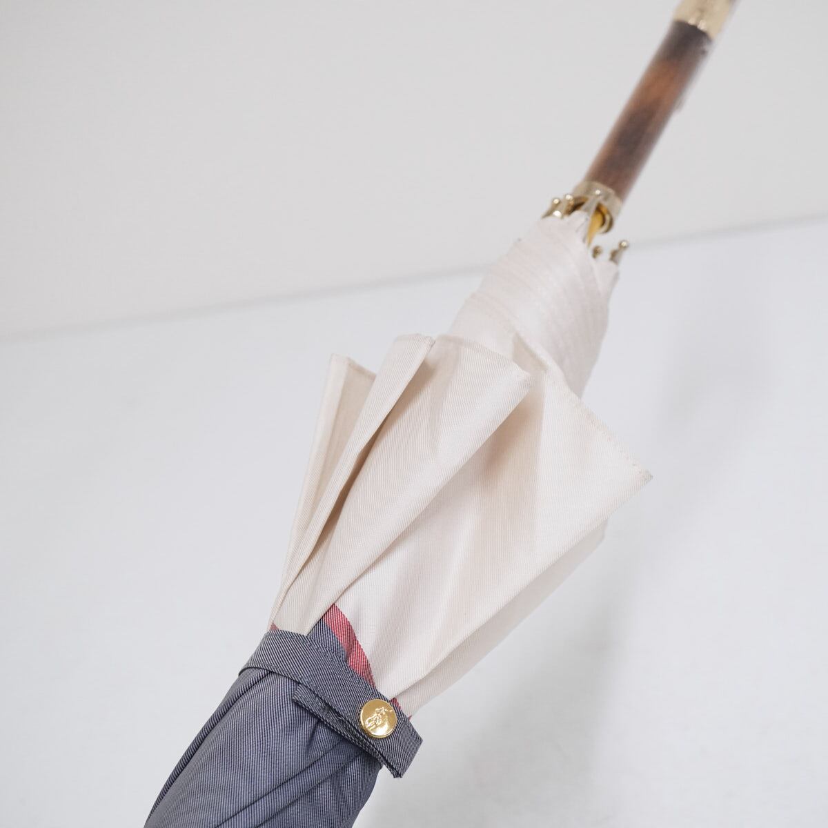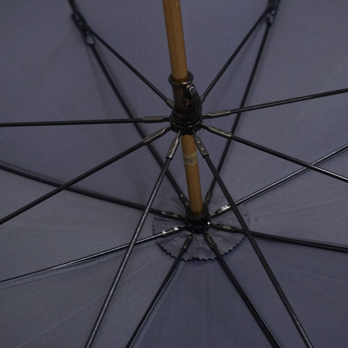 シンプルなデニムライクなブルーの生地を基調に外周をホワイトの生地で囲んだシックなデザインの傘です。