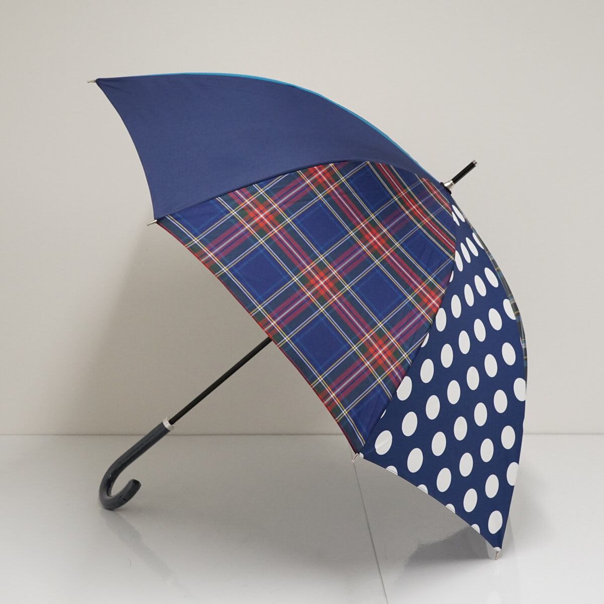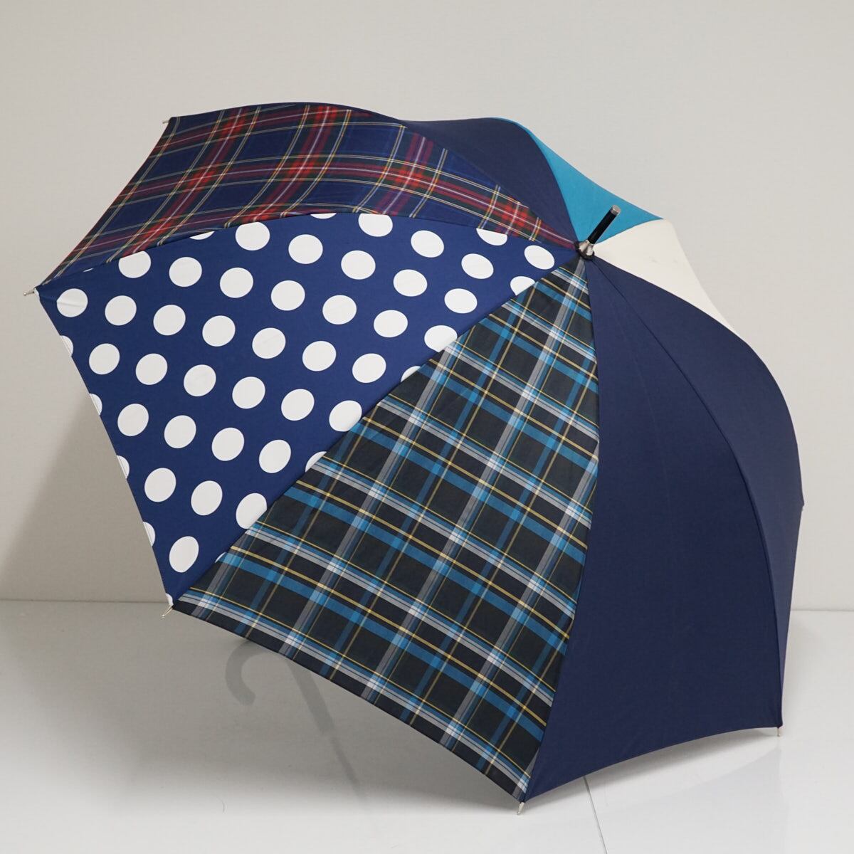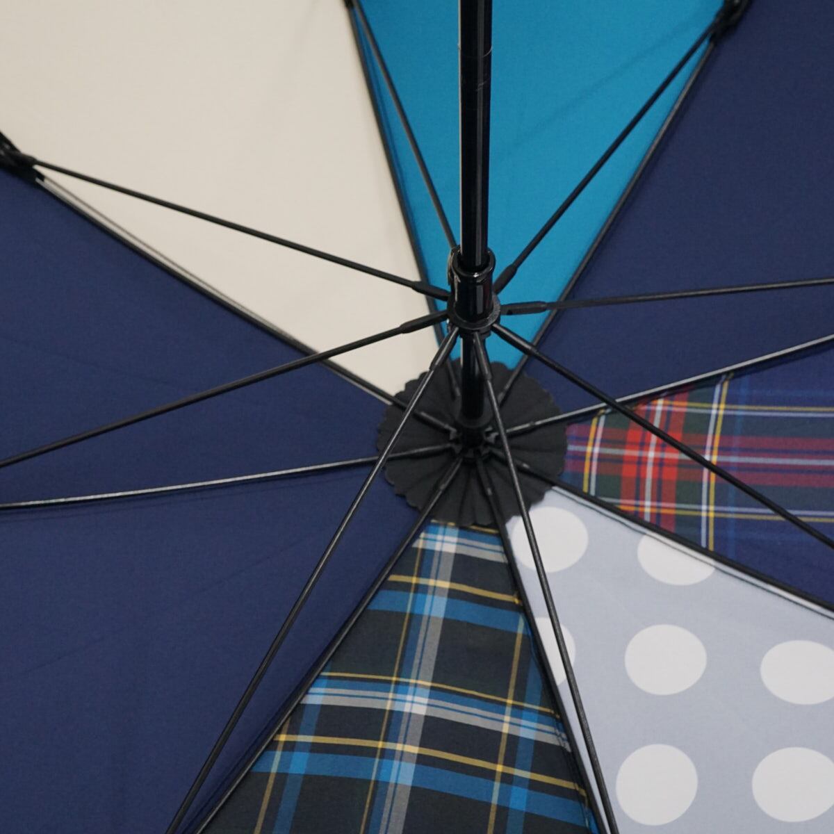 傘の1コマ1コマ異なった色柄のものを組み合わせた張り分けタイプのパターン傘です。