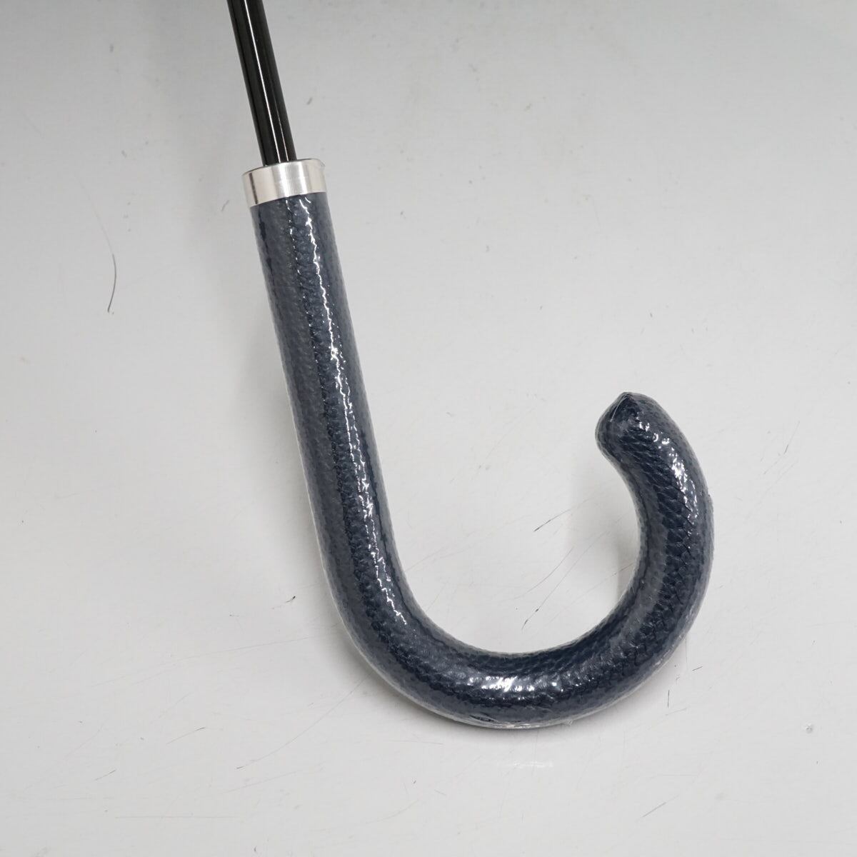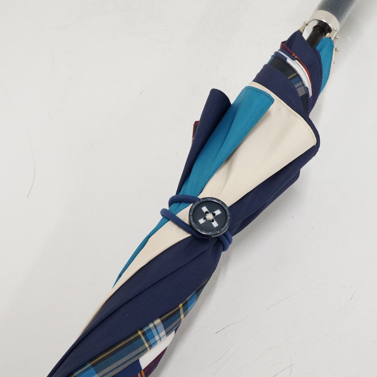 PLUSRINGと刻印されたボタンに、ゴムバンドのストラップを引っかける簡単仕様になっており、左右どちらから巻いても傘を束ねてしまうことができます。