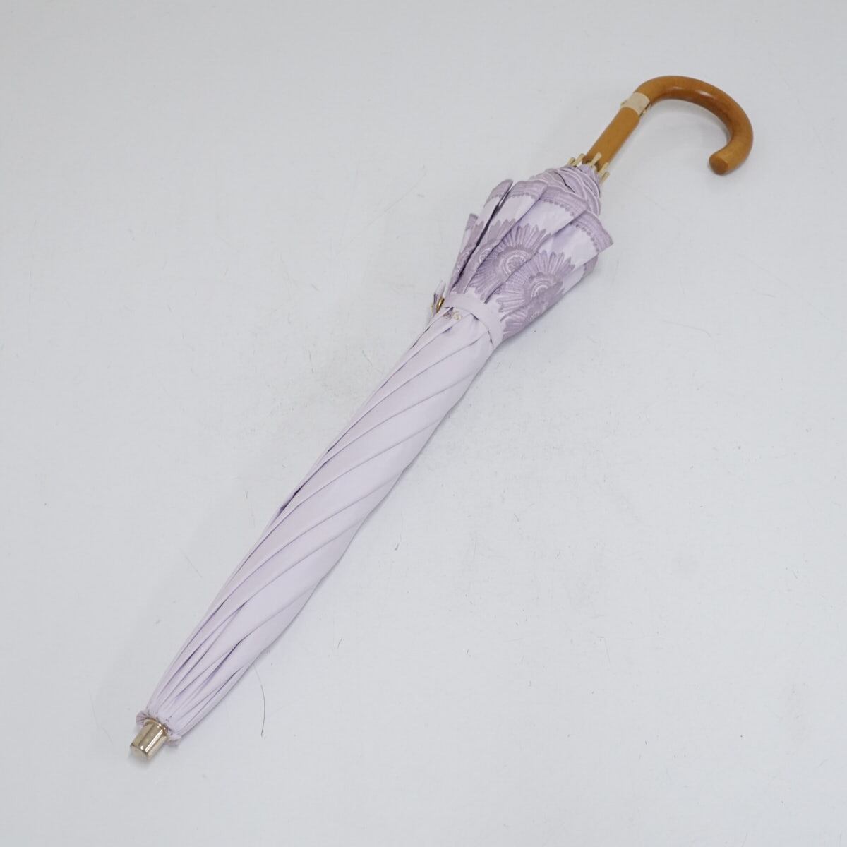 ペールピンクの生地にフラワー刺繍のデザインがキュートな雰囲気の晴雨兼用の日傘です。