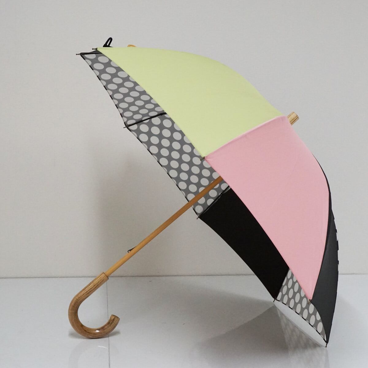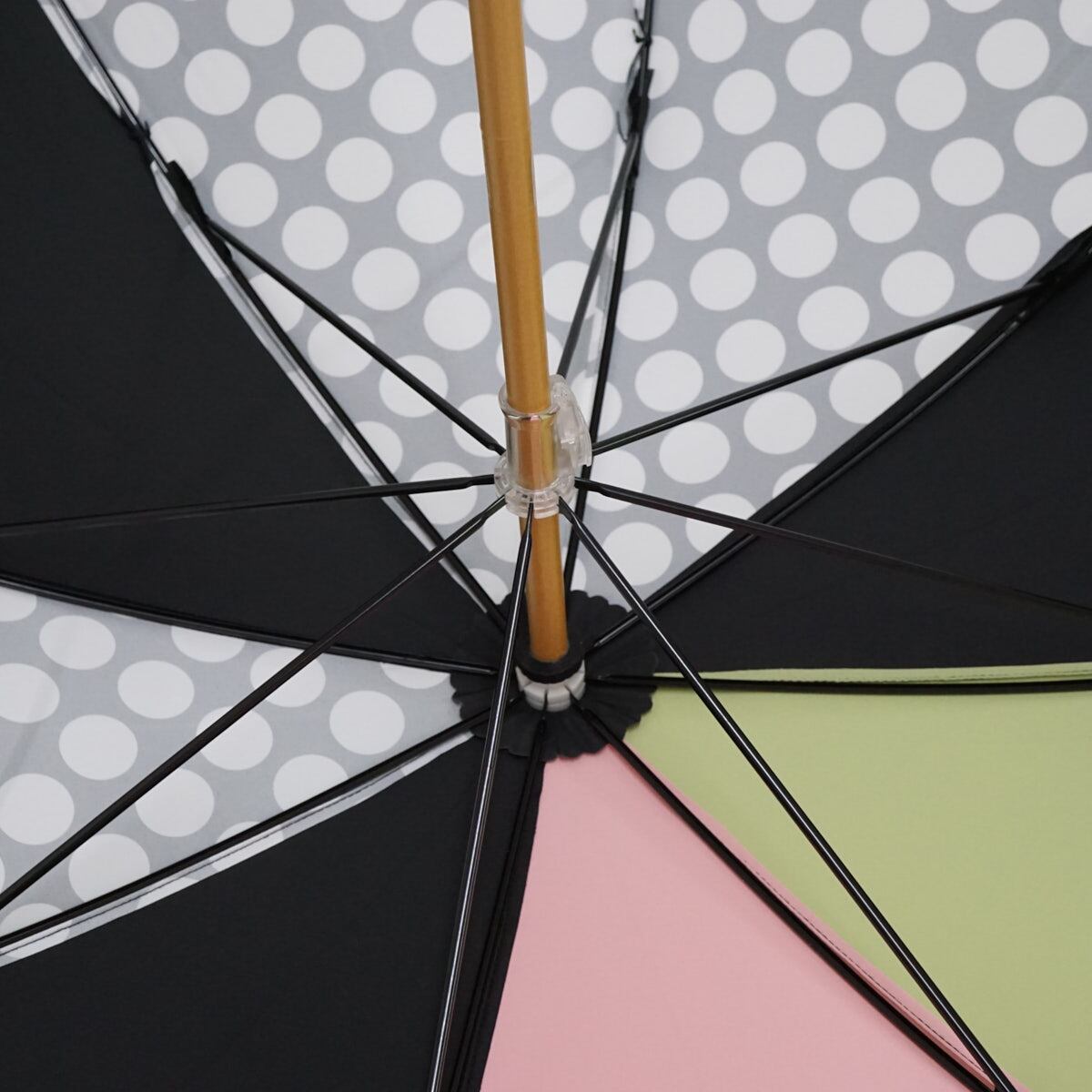 傘の1コマ1コマ異なった色柄のものを組み合わせた張り分けタイプのパターン傘です。