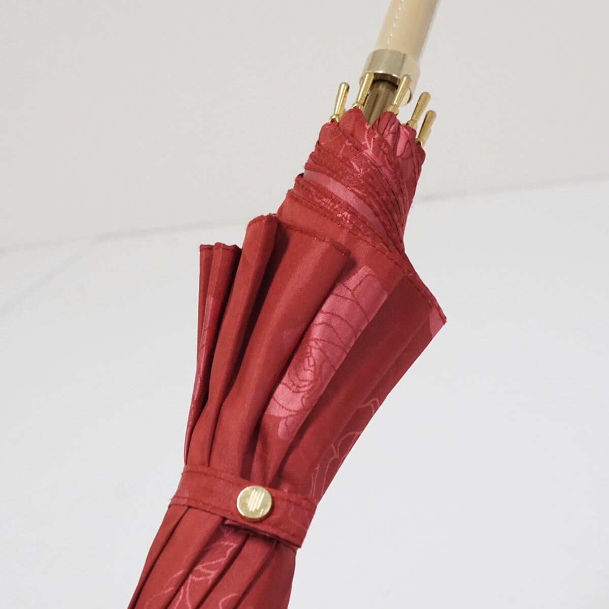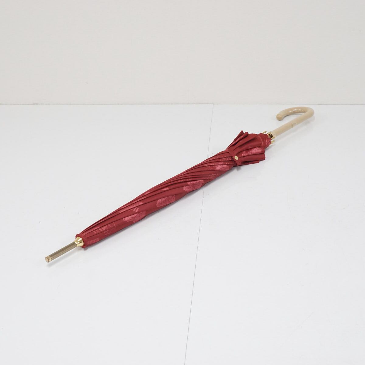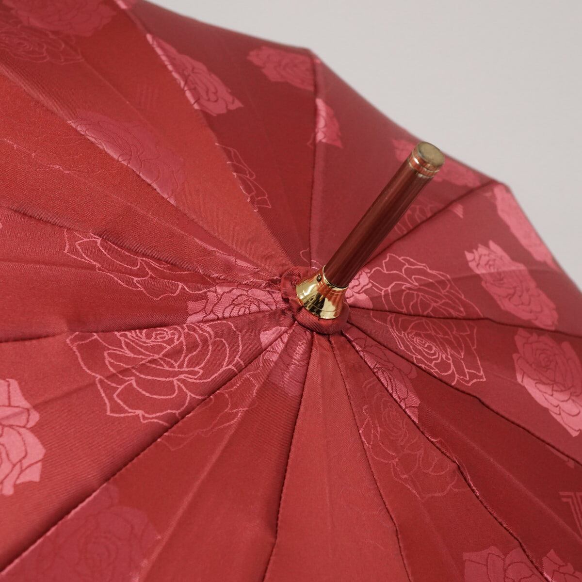 深みのあるレッドの生地全面にフラワープリントをデザインしたラグジュアリーなデザインの傘です。