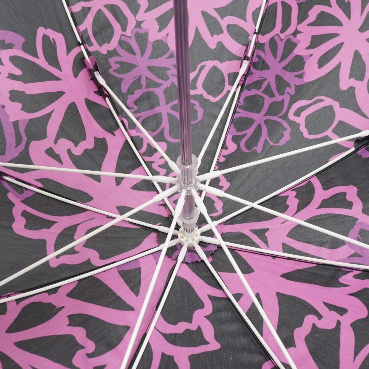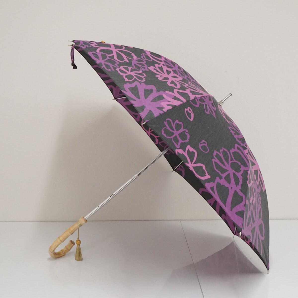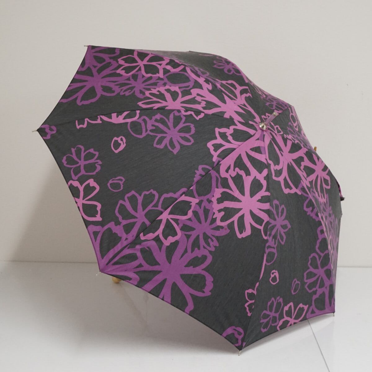 ダークグレーの生地に、パープルの上品な花々が咲き誇るデザインです。