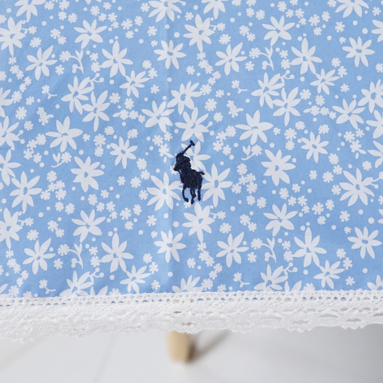 ライトブルー×ホワイトの小花柄の生地をベースに、外周をホワイトのレースで縁取ったフェミニンな印象の逸品です。