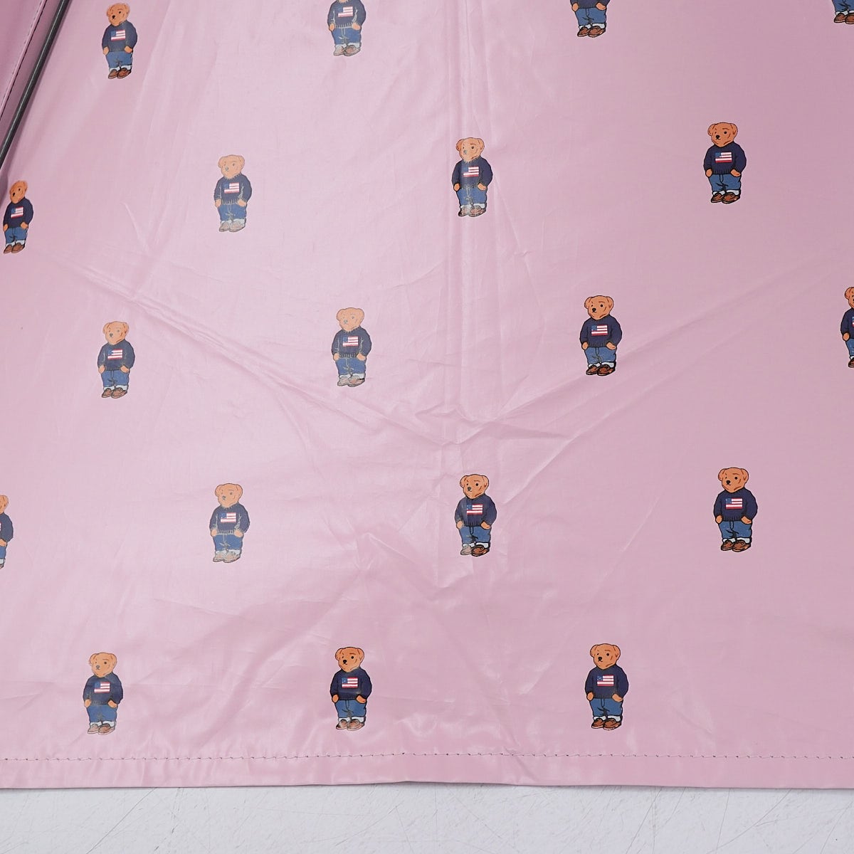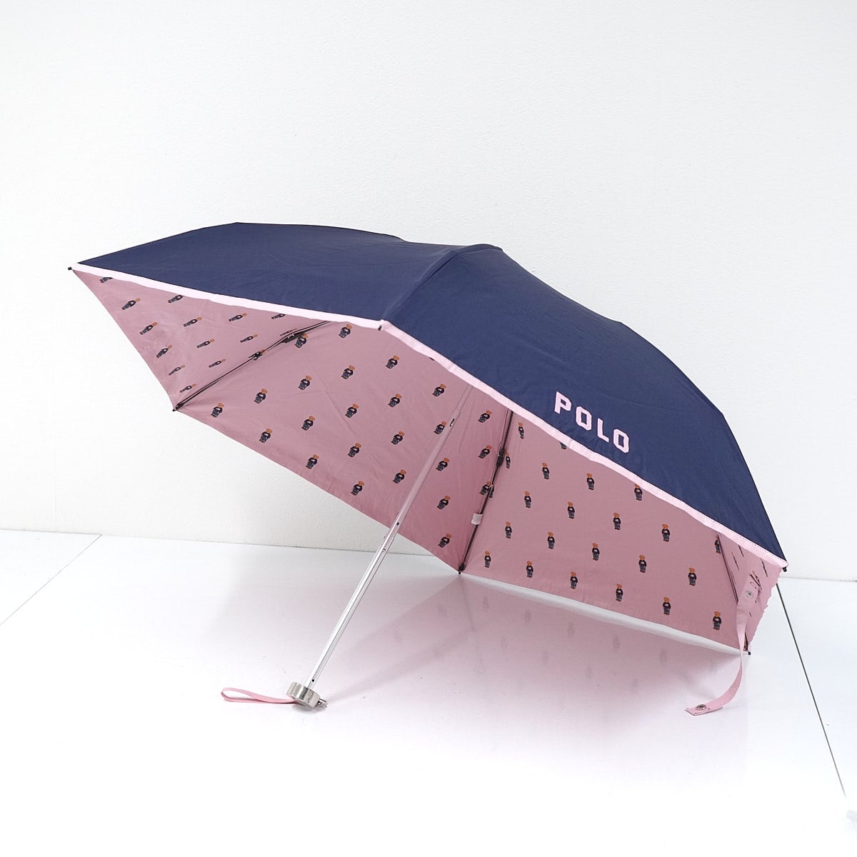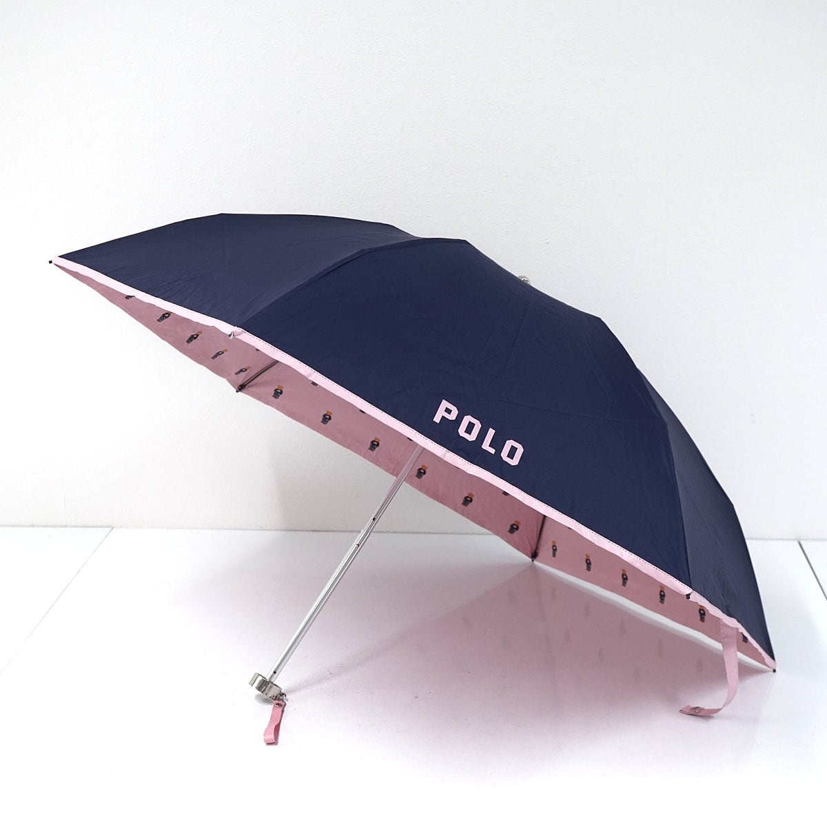 裏地にポロベアを散りばめたキュートなデザインの折りたたみパラソルです。